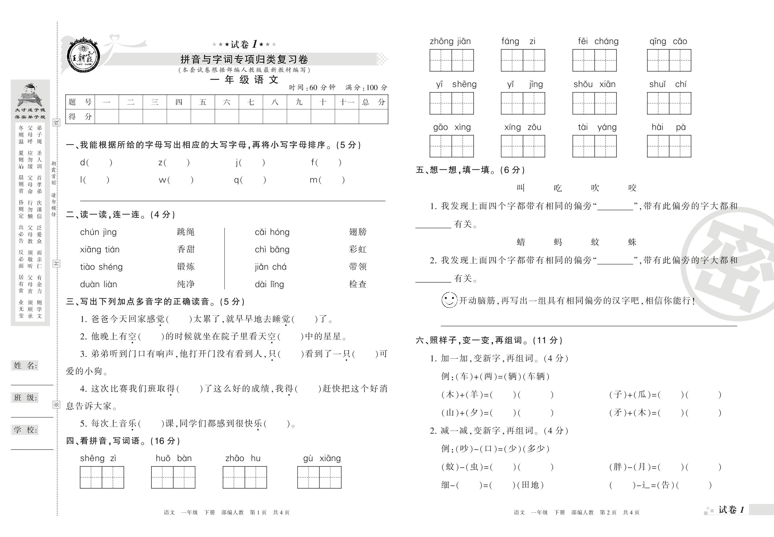 王朝霞期末专项卷——拼音与字词专项归类复习卷一年级下册语文(人教版)_R210731190911【1】