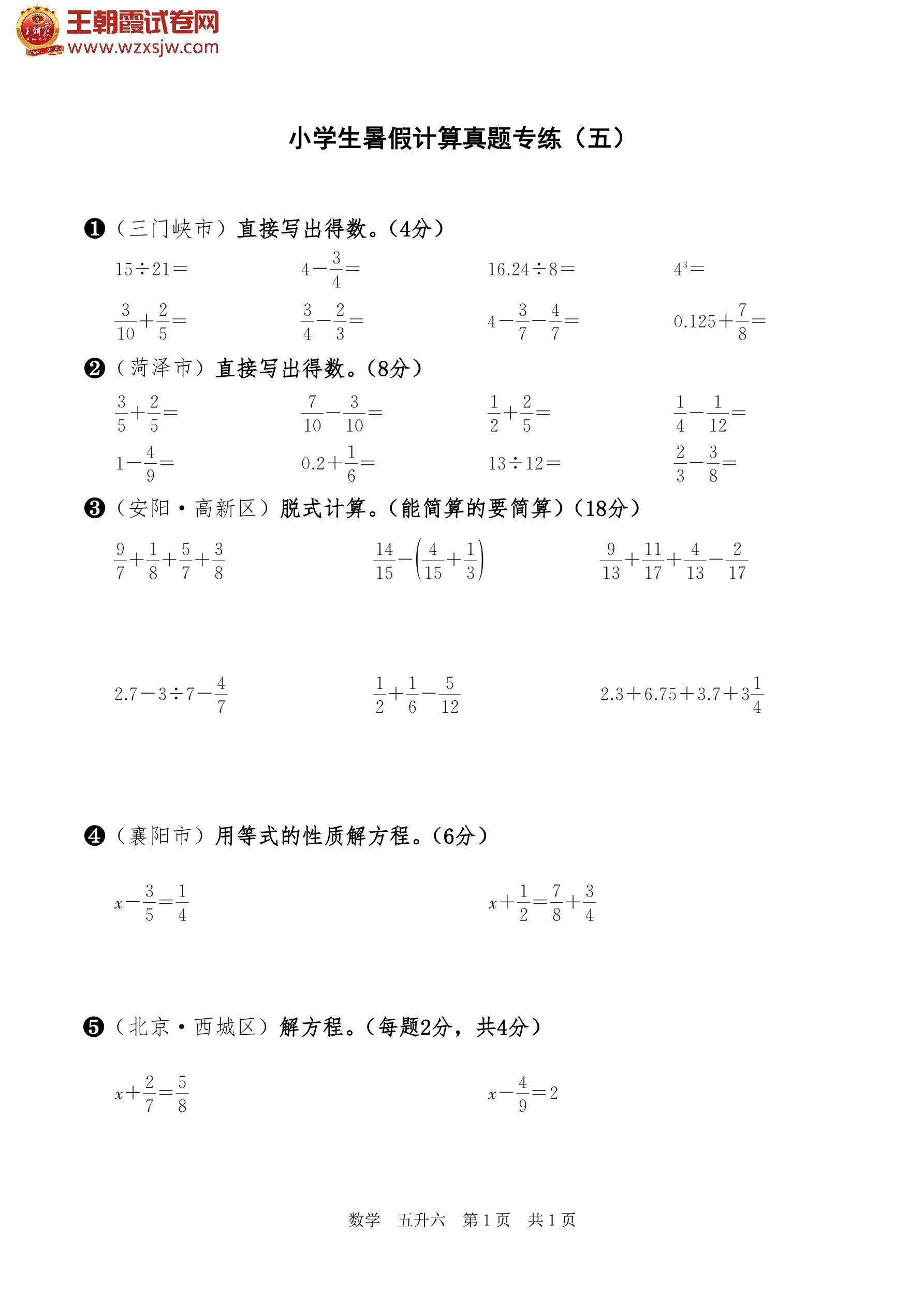 【五升六】小学生暑假计算真题专练(五)