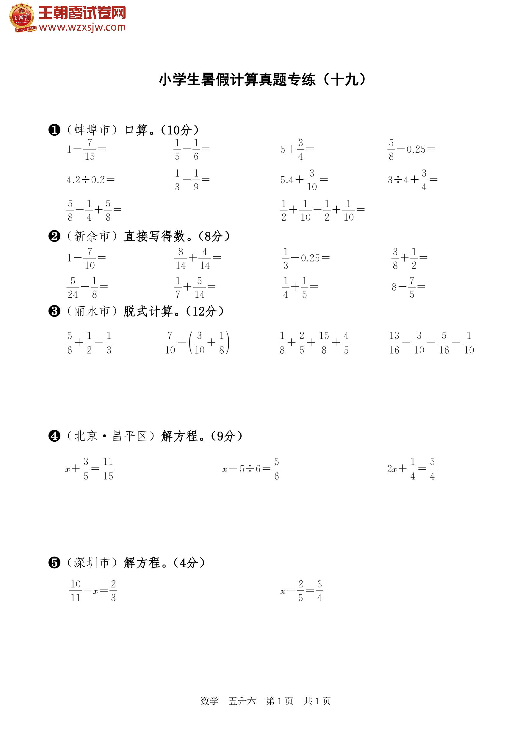 【五升六】小学生暑假计算真题专练(十九)