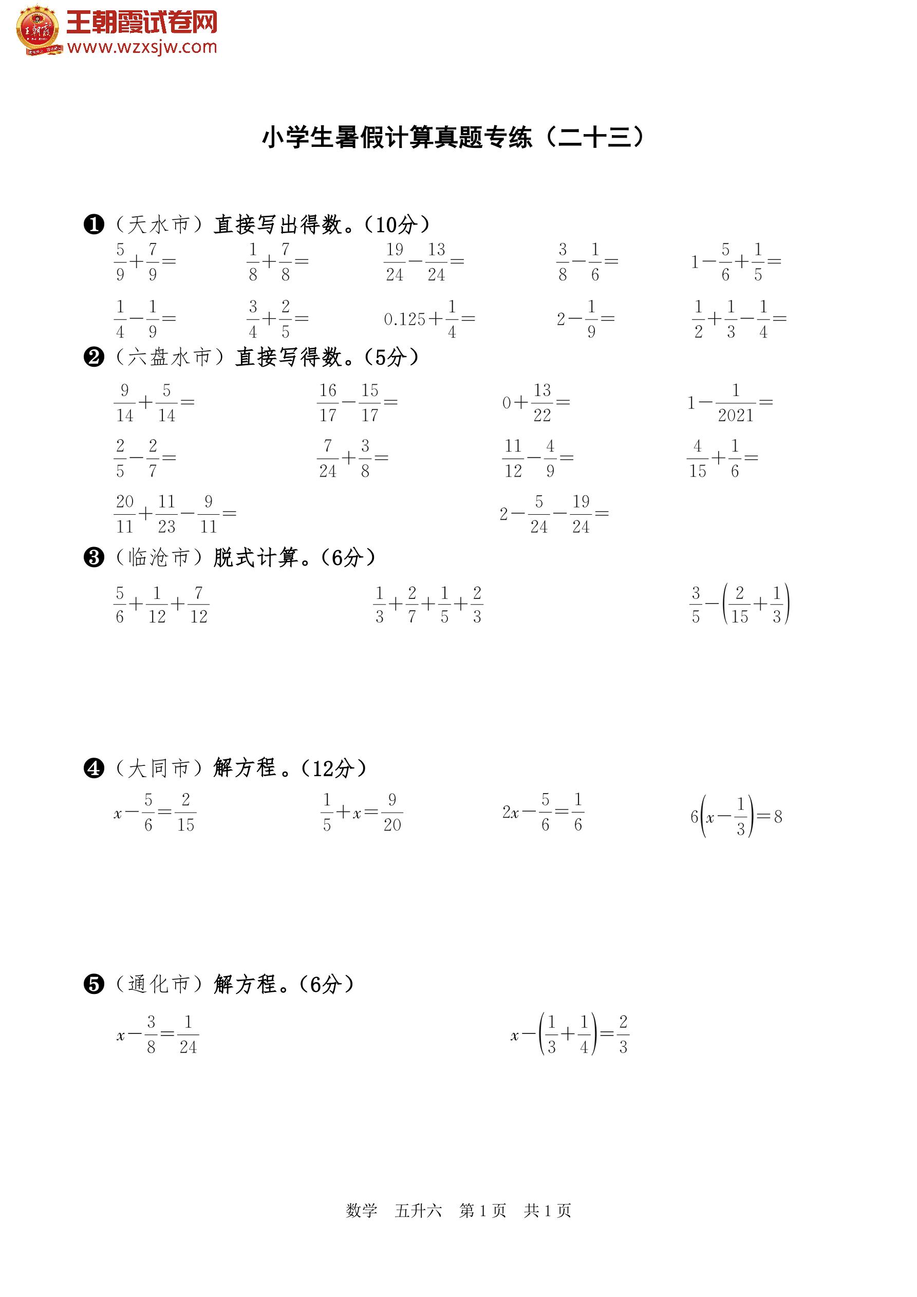 【五升六】小学生暑假计算真题专练(二十三)