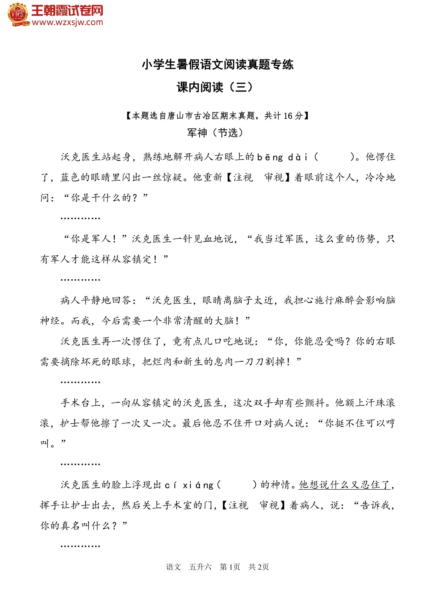 【五升六】小学生暑假语文阅读真题专练——课内阅读(三)