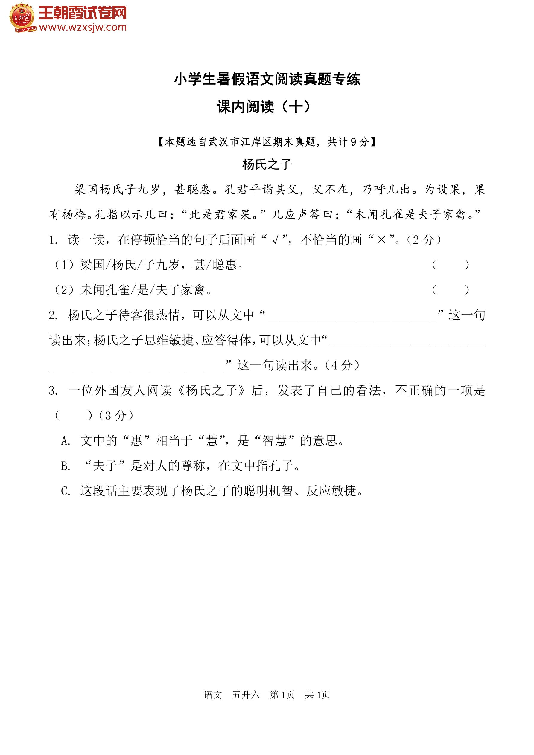 【五升六】小学生暑假语文阅读真题专练——课内阅读(十)