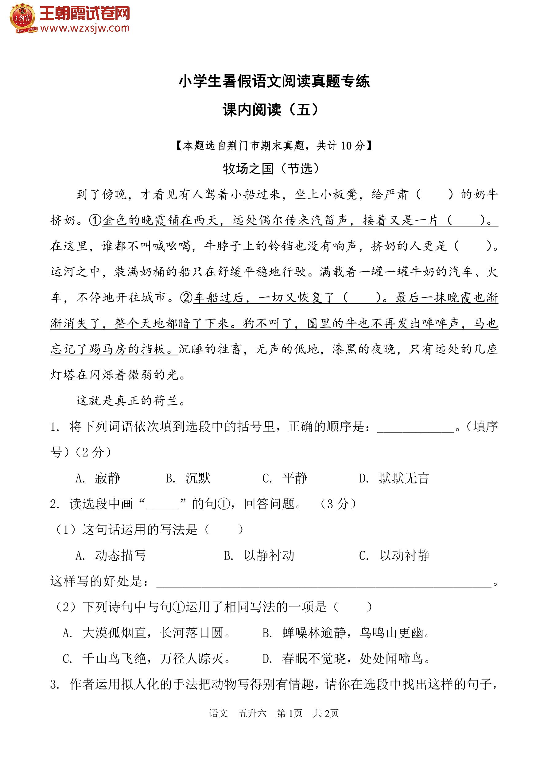 【五升六】小学生暑假语文阅读真题专练——课内阅读(五)