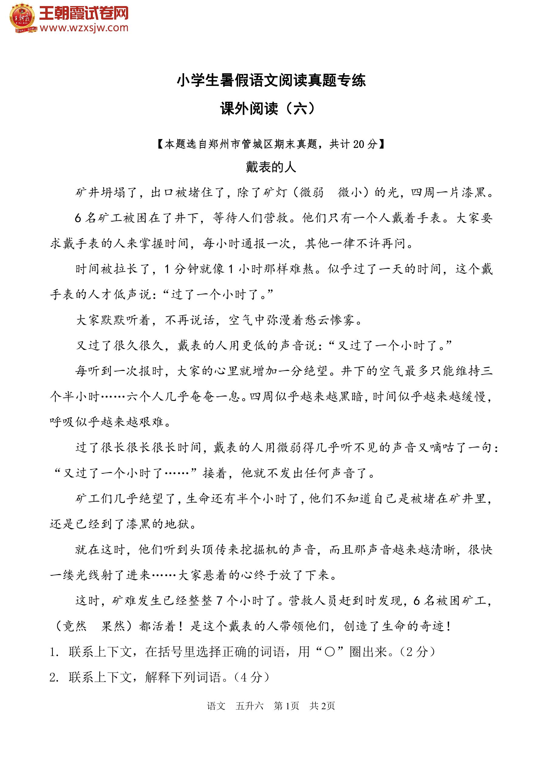 【五升六】小学生暑假语文阅读真题专练——课外阅读(六)