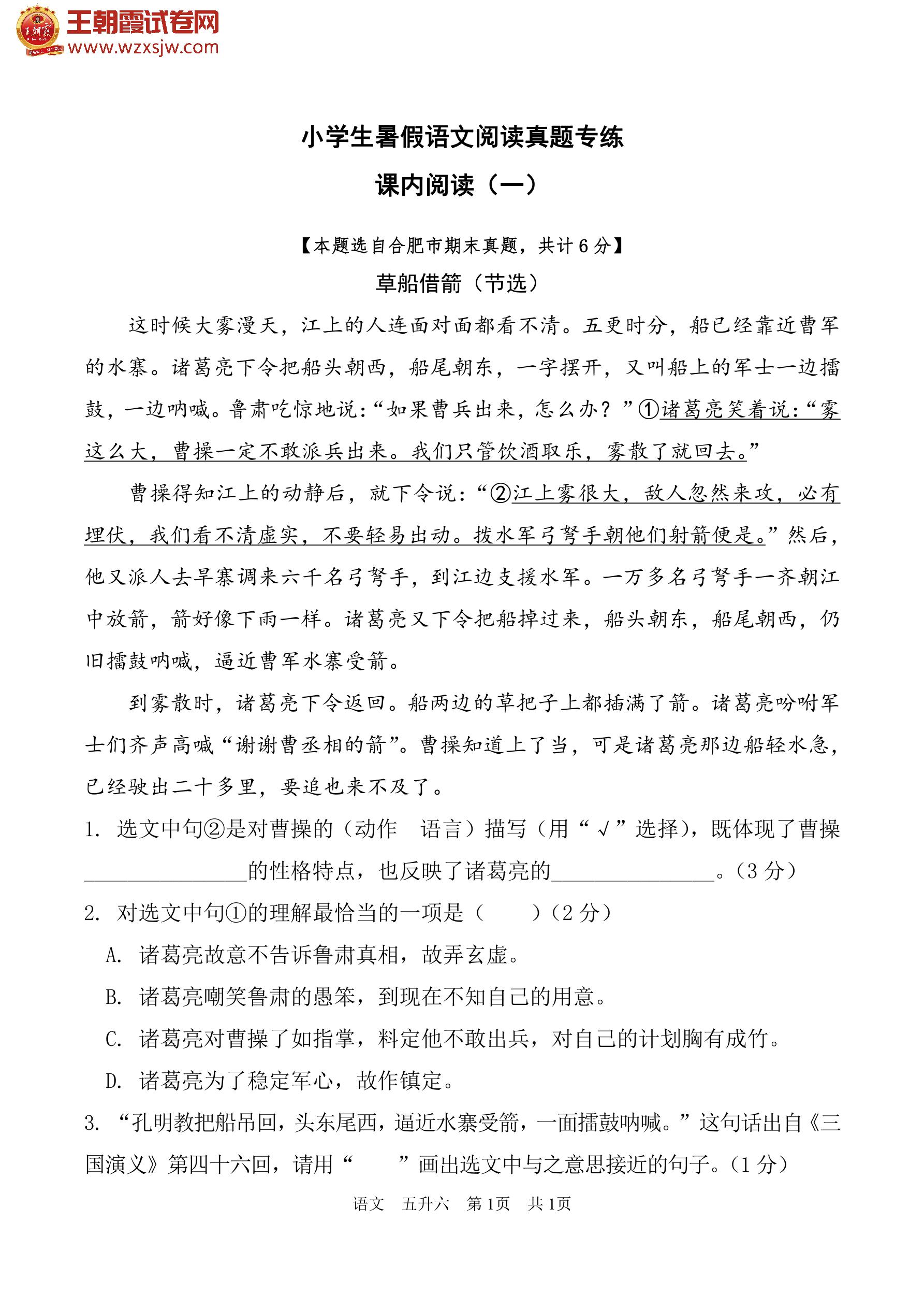 【五升六】小学生暑假语文阅读真题专练——课内阅读(一)