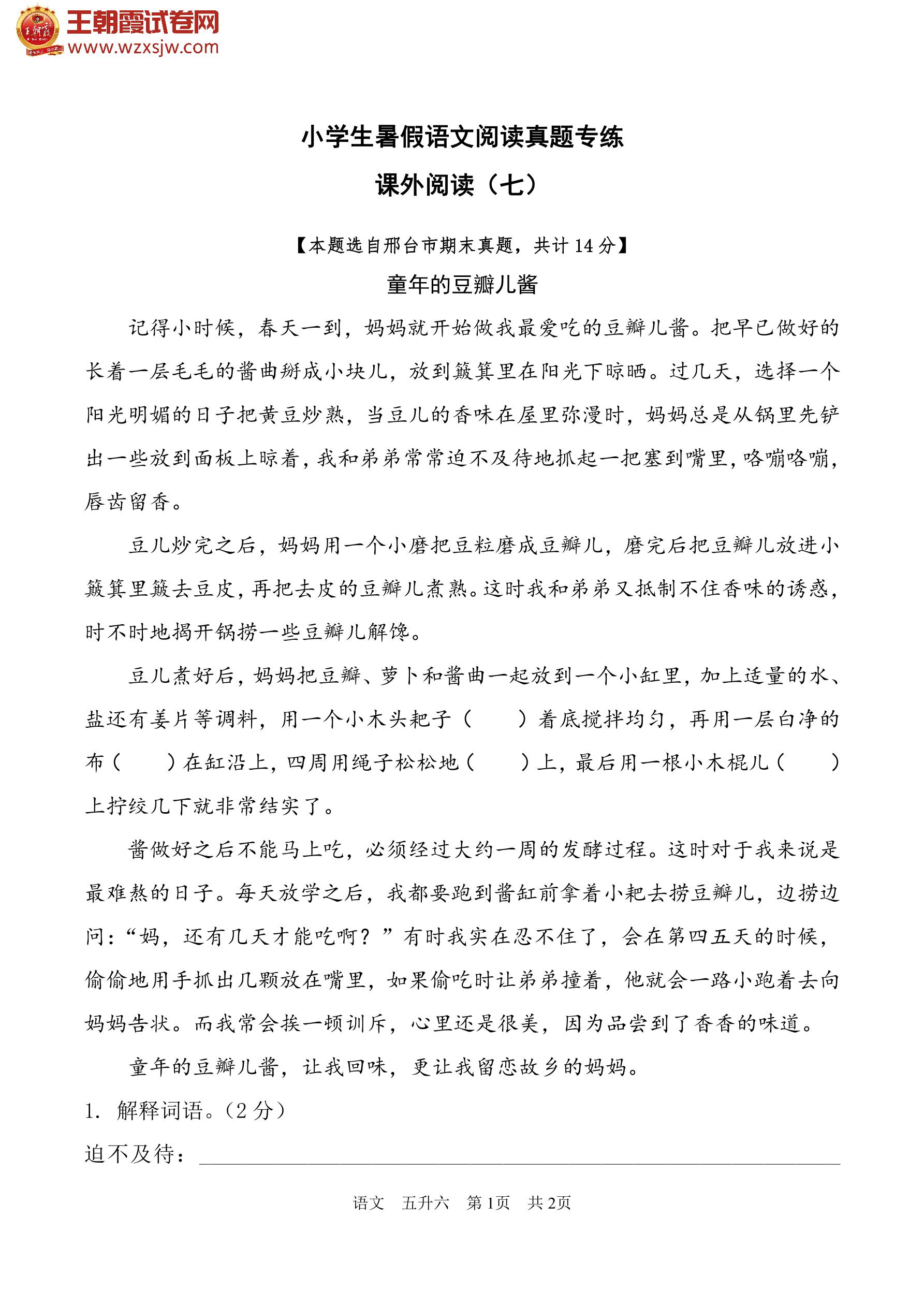 【五升六】小学生暑假语文阅读真题专练——课外阅读(七)