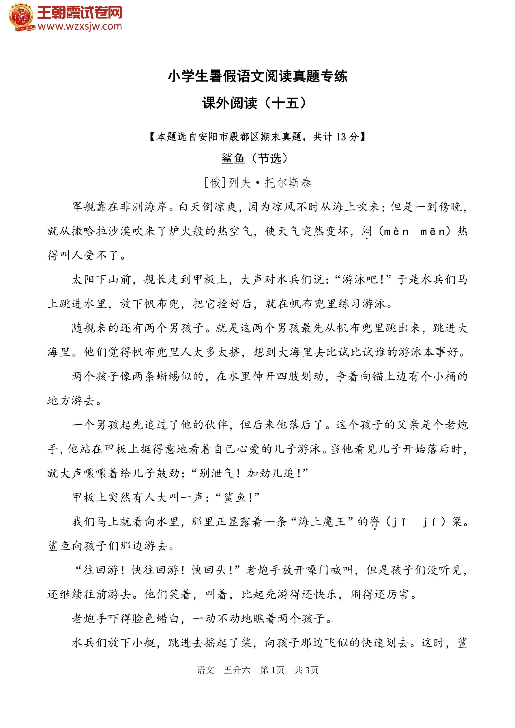 【五升六】小学生暑假语文阅读真题专练——课外阅读(十五)