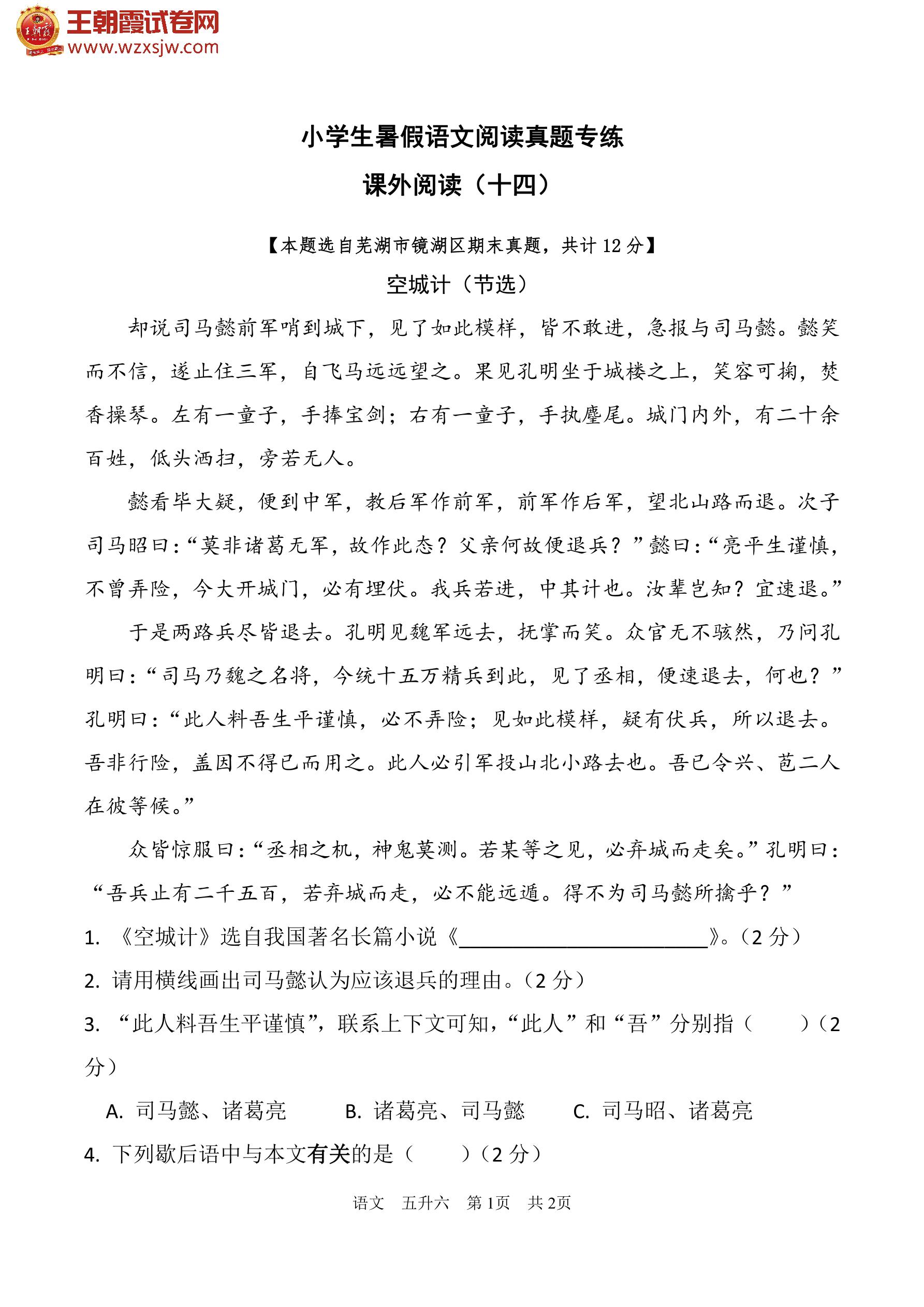 【五升六】小学生暑假语文阅读真题专练——课外阅读(十四)