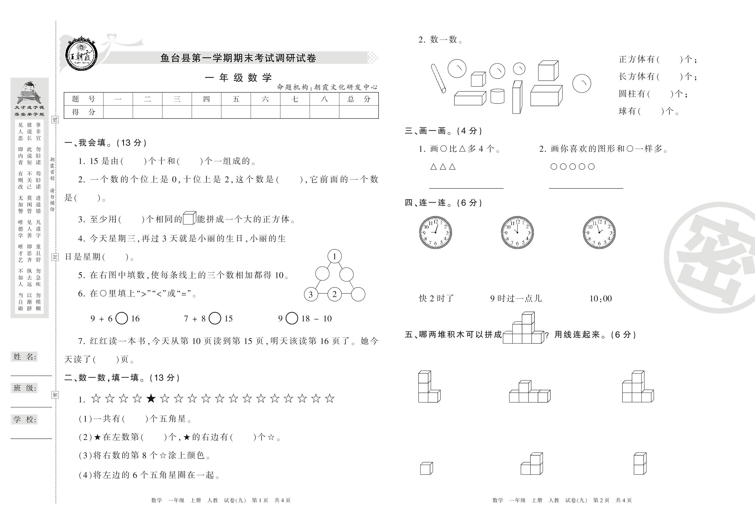 2016-2017学年第一学期济宁市鱼台县一年级数学试卷(人教版)【9】