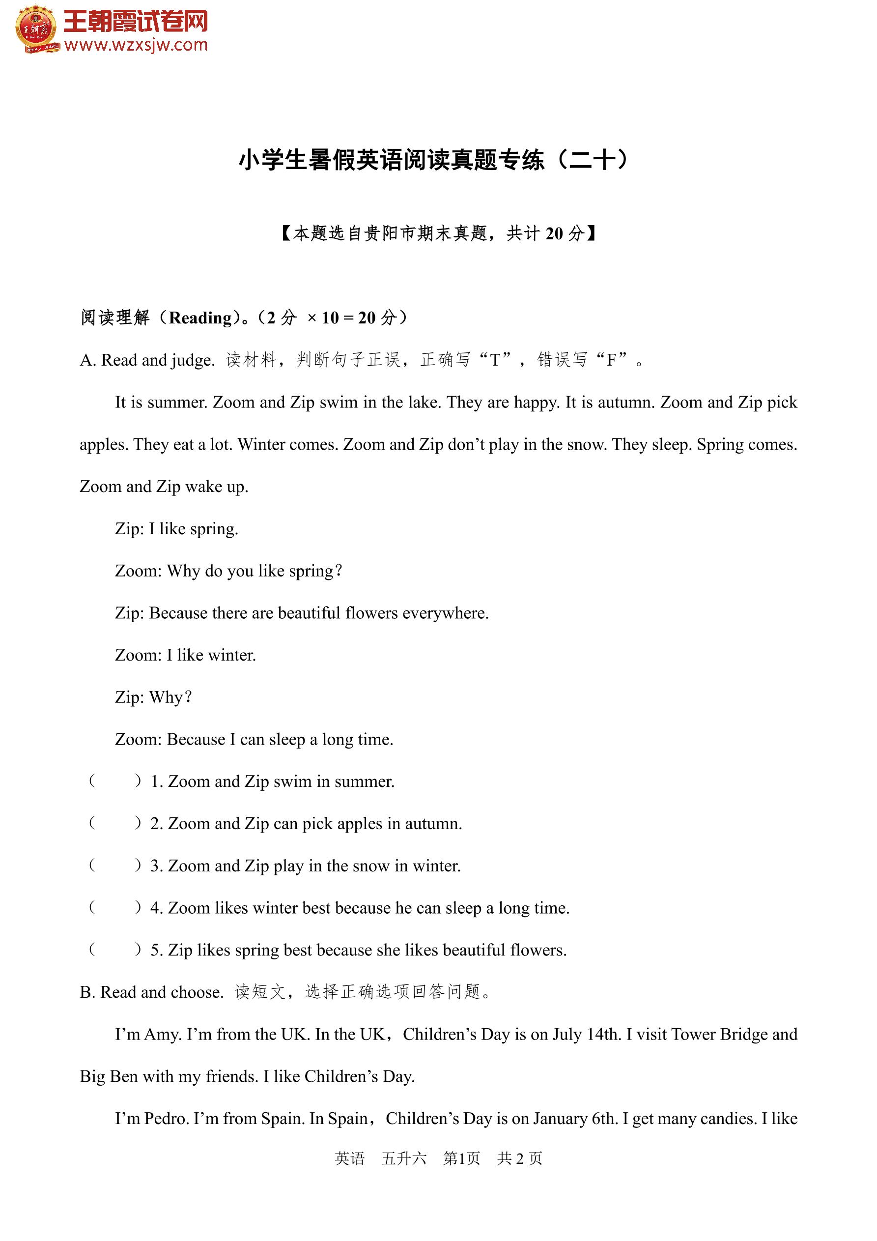 【五升六】小学生暑假英语阅读真题专练(二十)