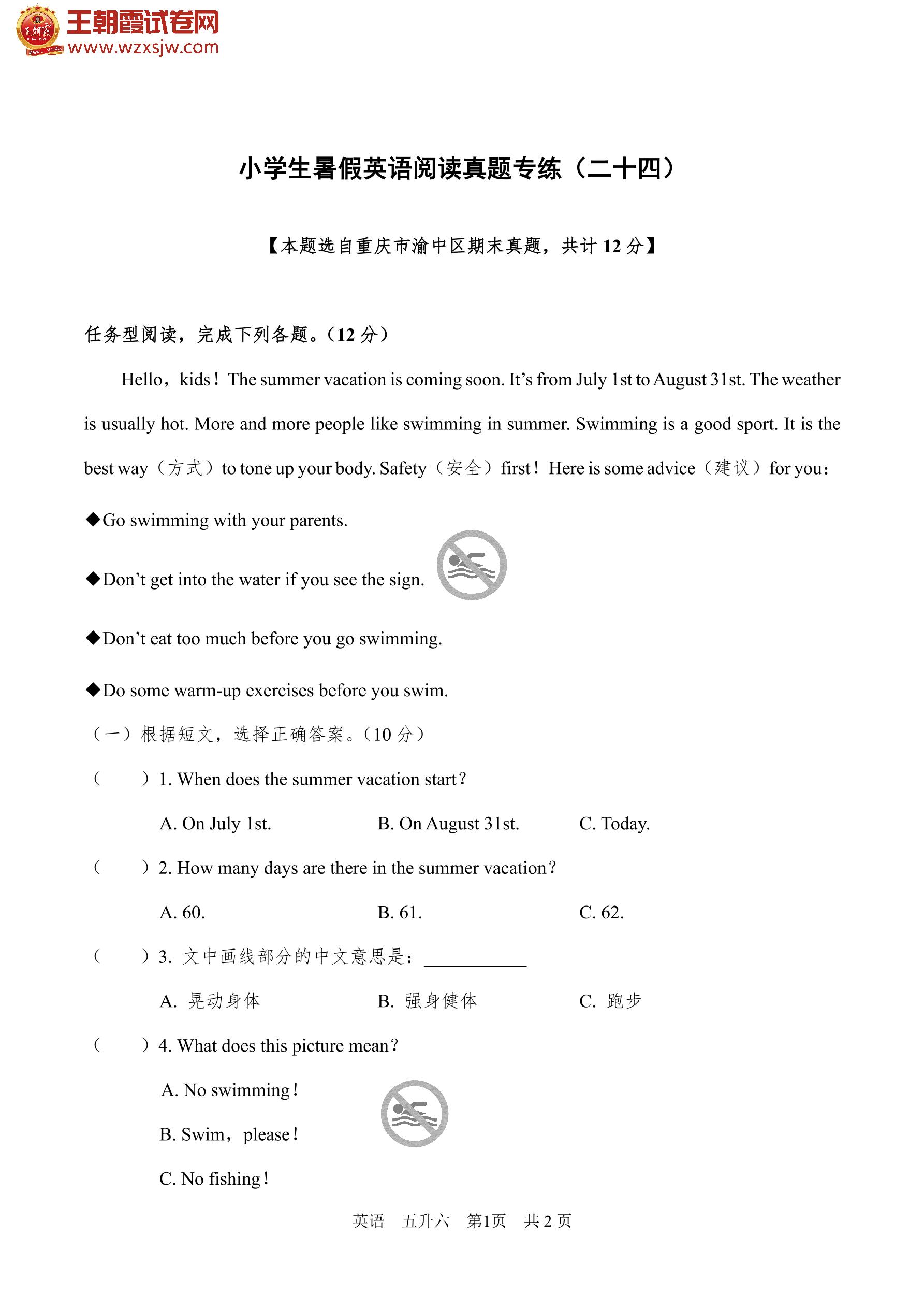 【五升六】小学生暑假英语阅读真题专练(二十四)