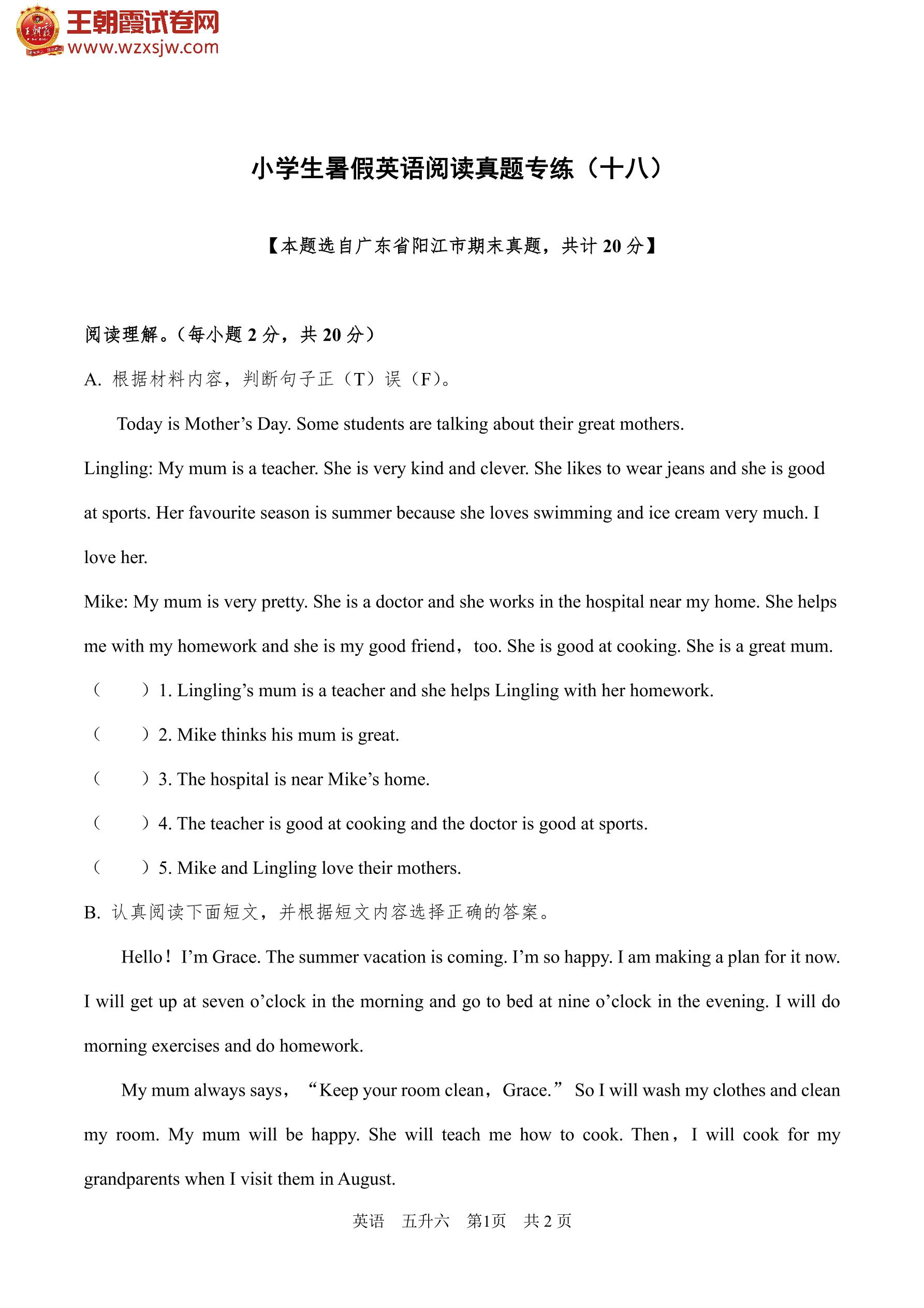 【五升六】小学生暑假英语阅读真题专练(十八)