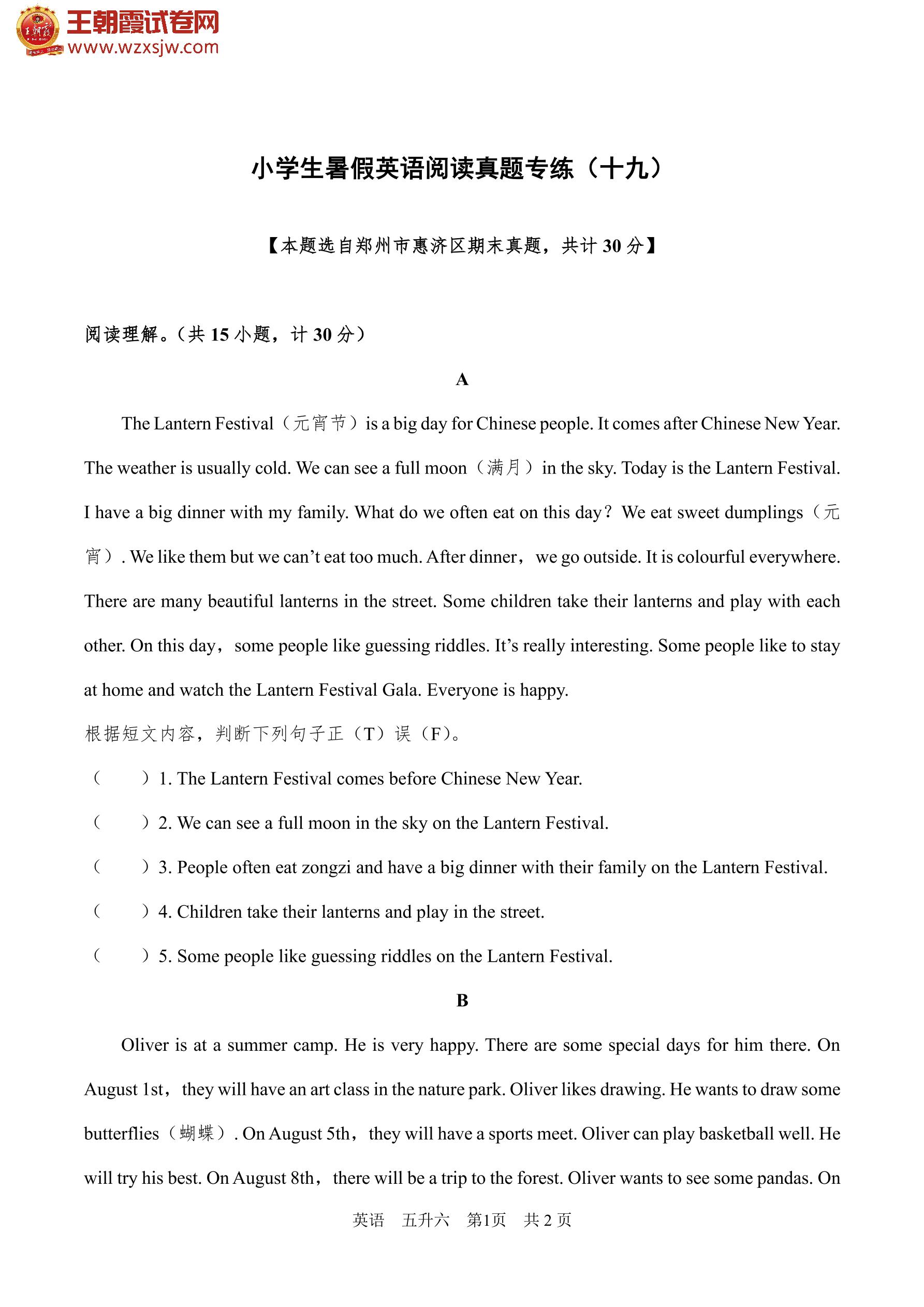 【五升六】小学生暑假英语阅读真题专练(十九)