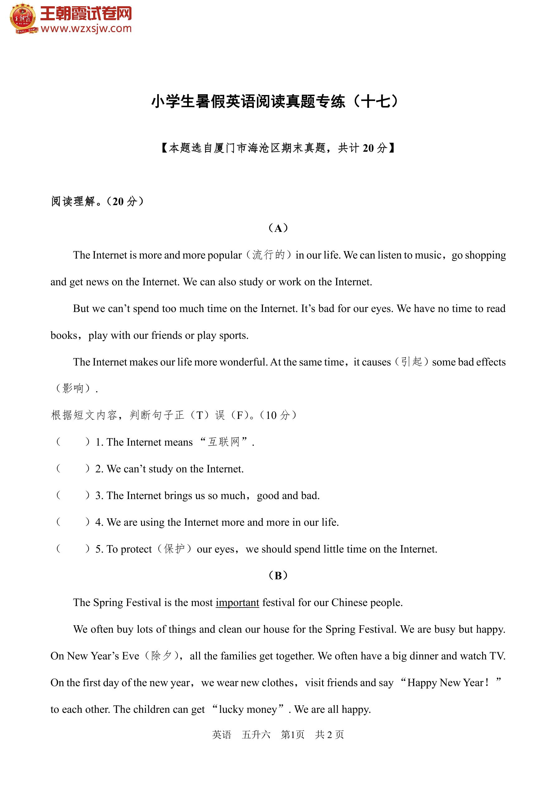 【五升六】小学生暑假英语阅读真题专练(十七)