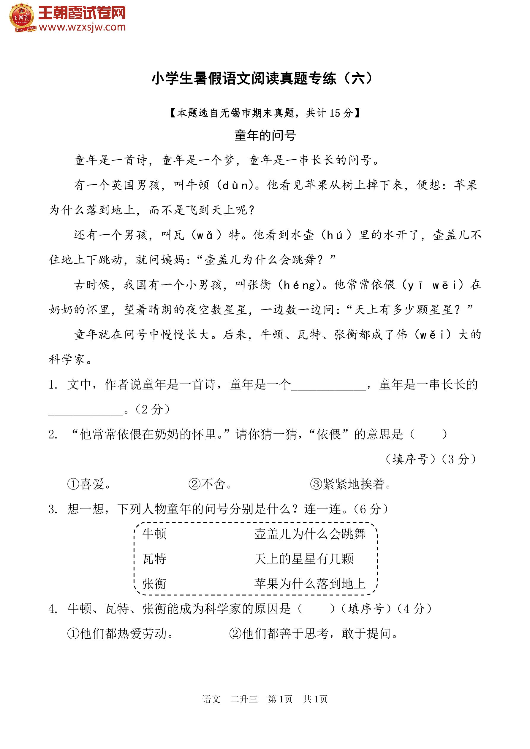 【二升三】小学生暑假语文阅读真题专练(六)