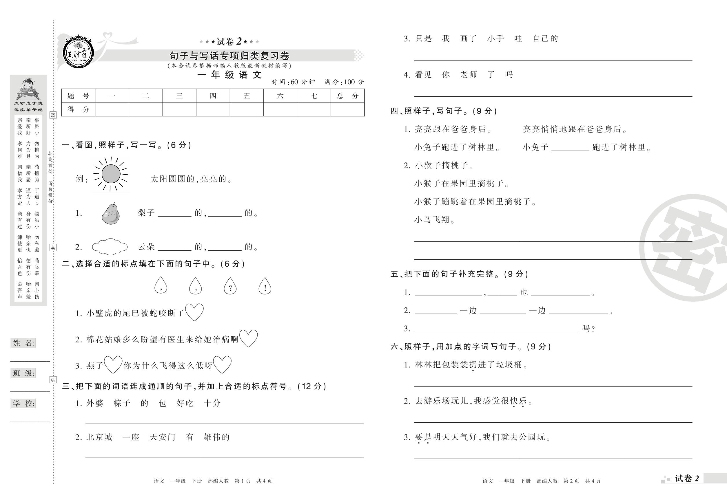 王朝霞期末专项卷——句子与写话专项归类复习卷一年级下册语文(人教版)_R210731190915【2】