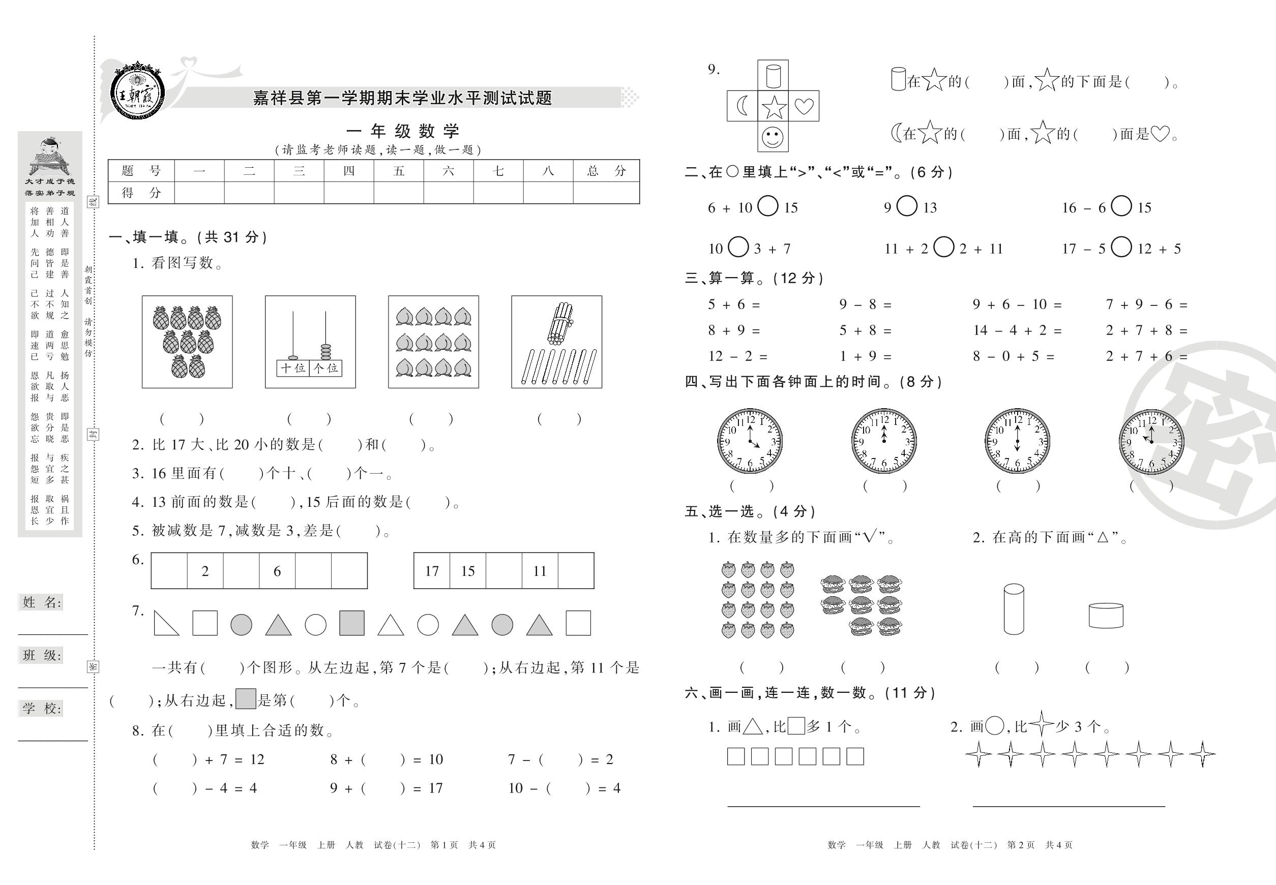 2016-2017学年第一学期济宁市嘉祥县一年级数学试卷(人教版)【12】
