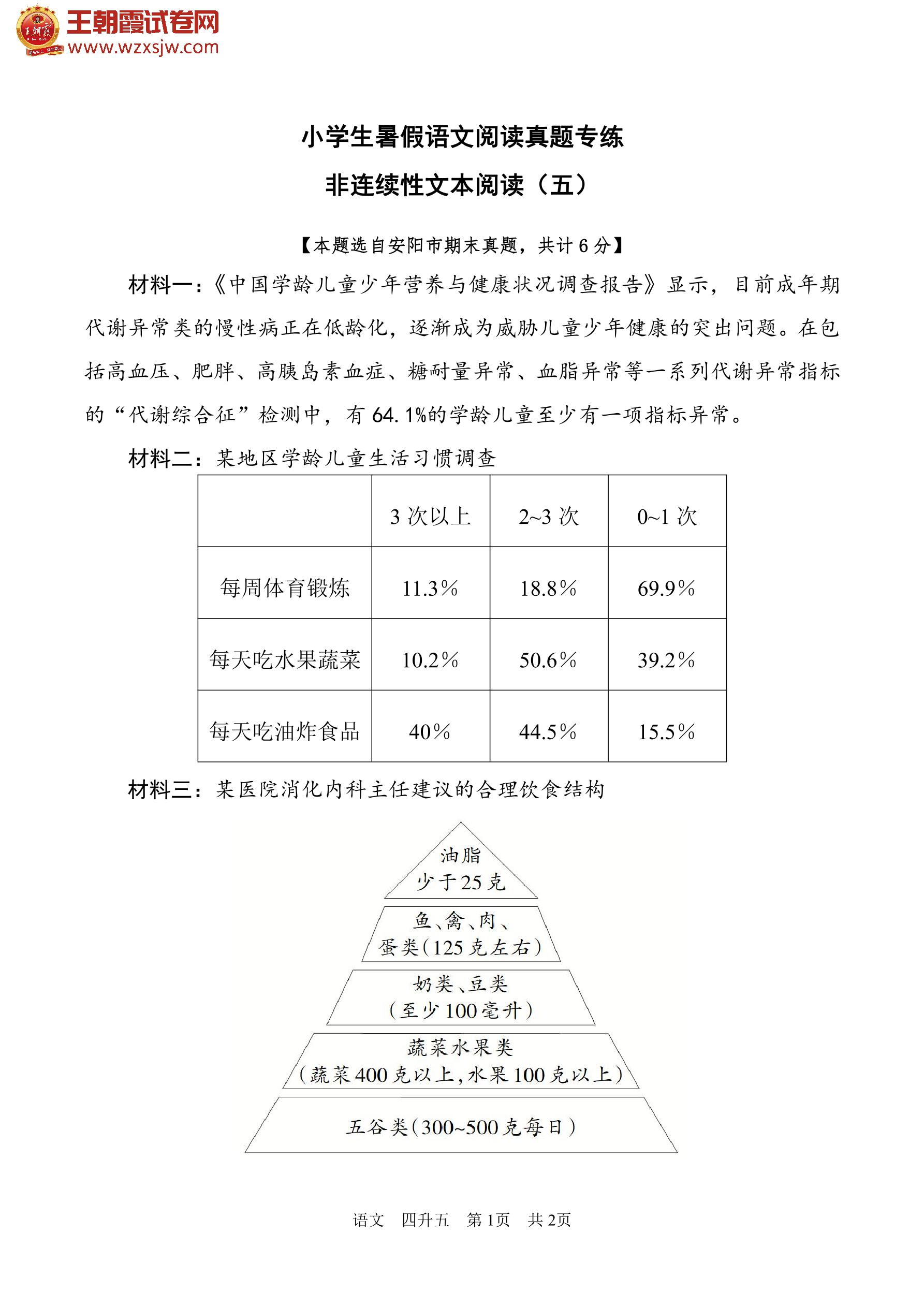 【四升五】小学生暑假语文阅读真题专练——非连续性文本阅读(五)