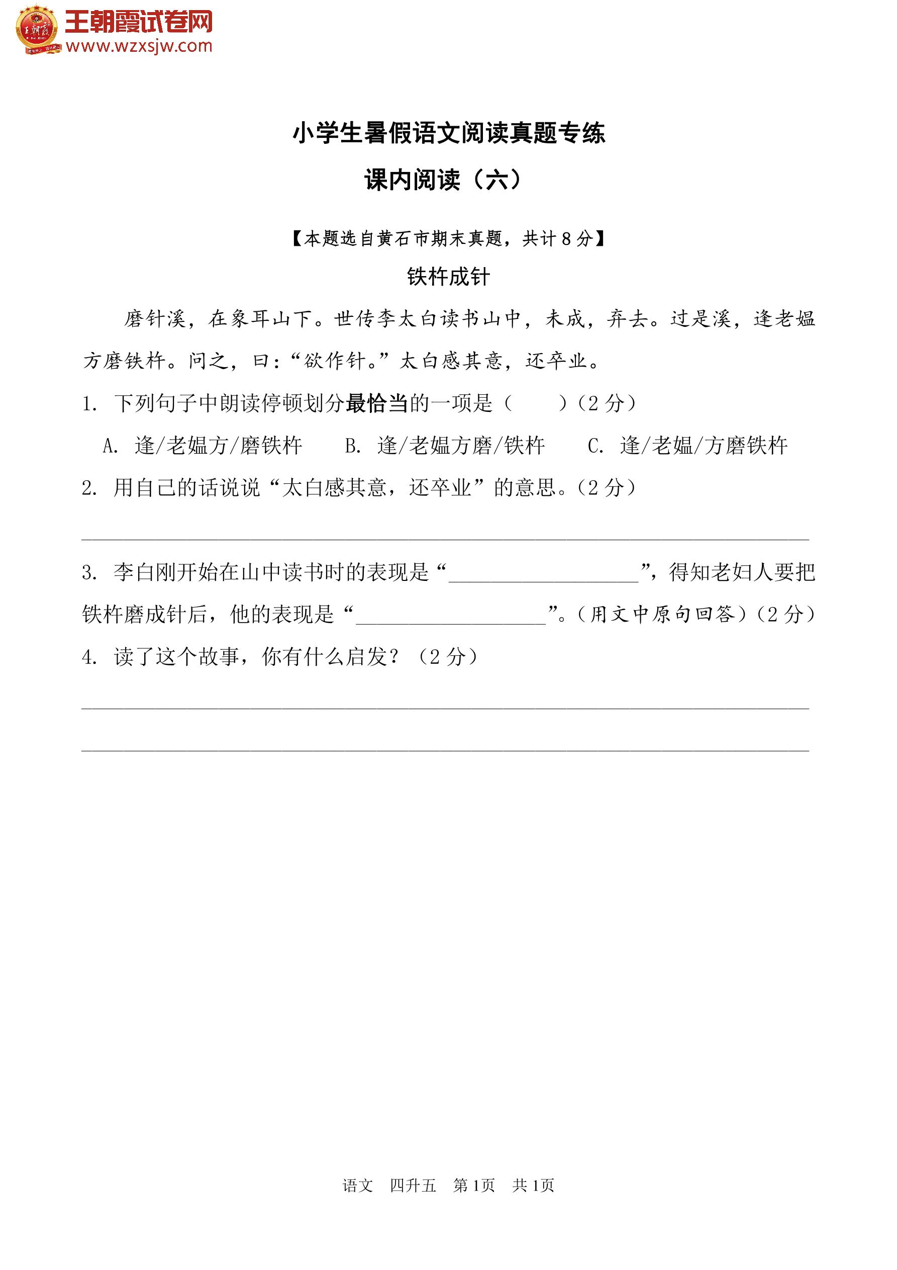 【四升五】小学生暑假语文阅读真题专练——课内阅读(六)