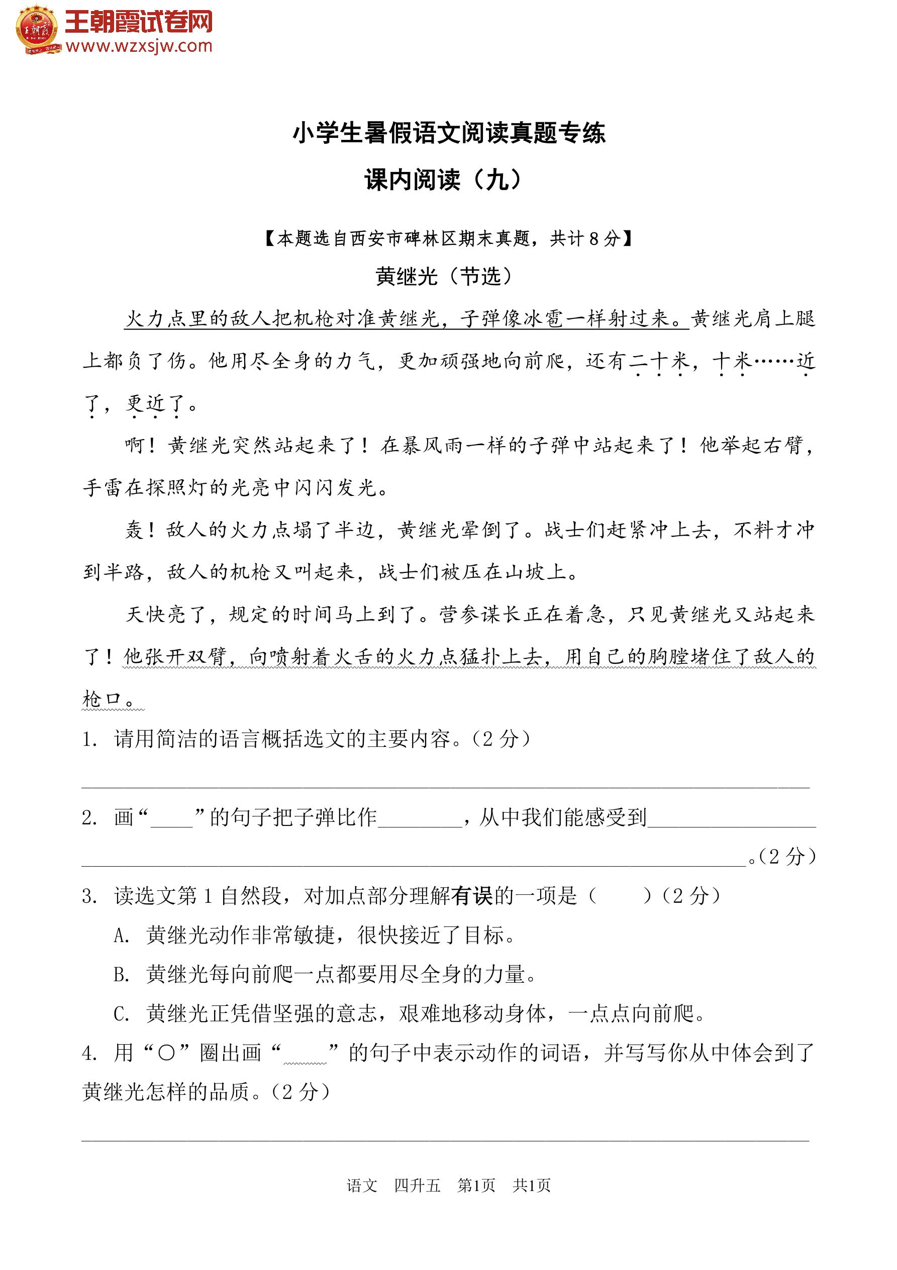 【四升五】小学生暑假语文阅读真题专练——课内阅读(九)