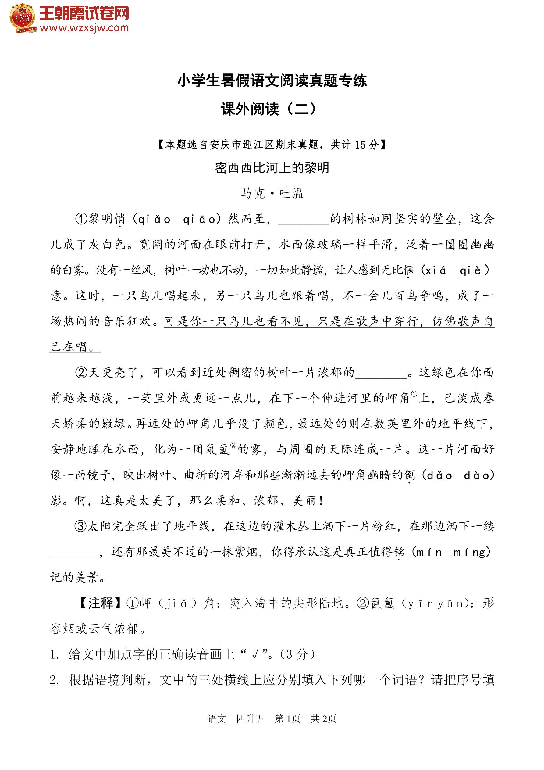 【四升五】小学生暑假语文阅读真题专练——课外阅读(二)