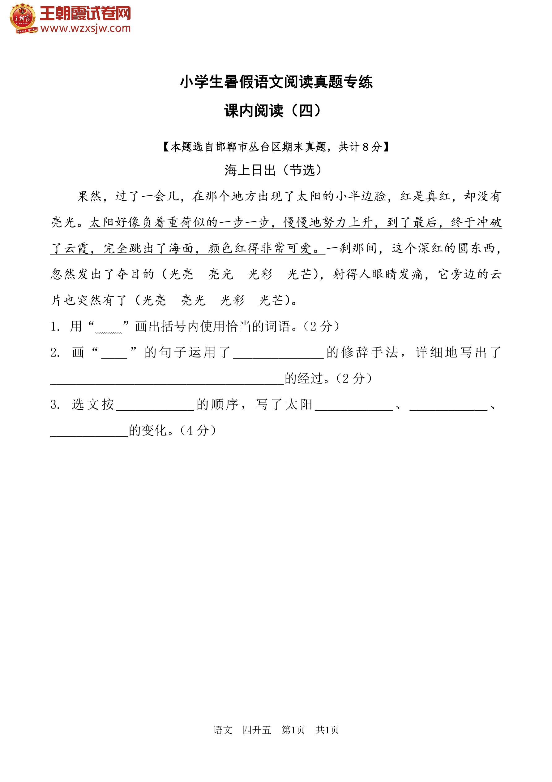 【四升五】小学生暑假语文阅读真题专练——课内阅读(四)