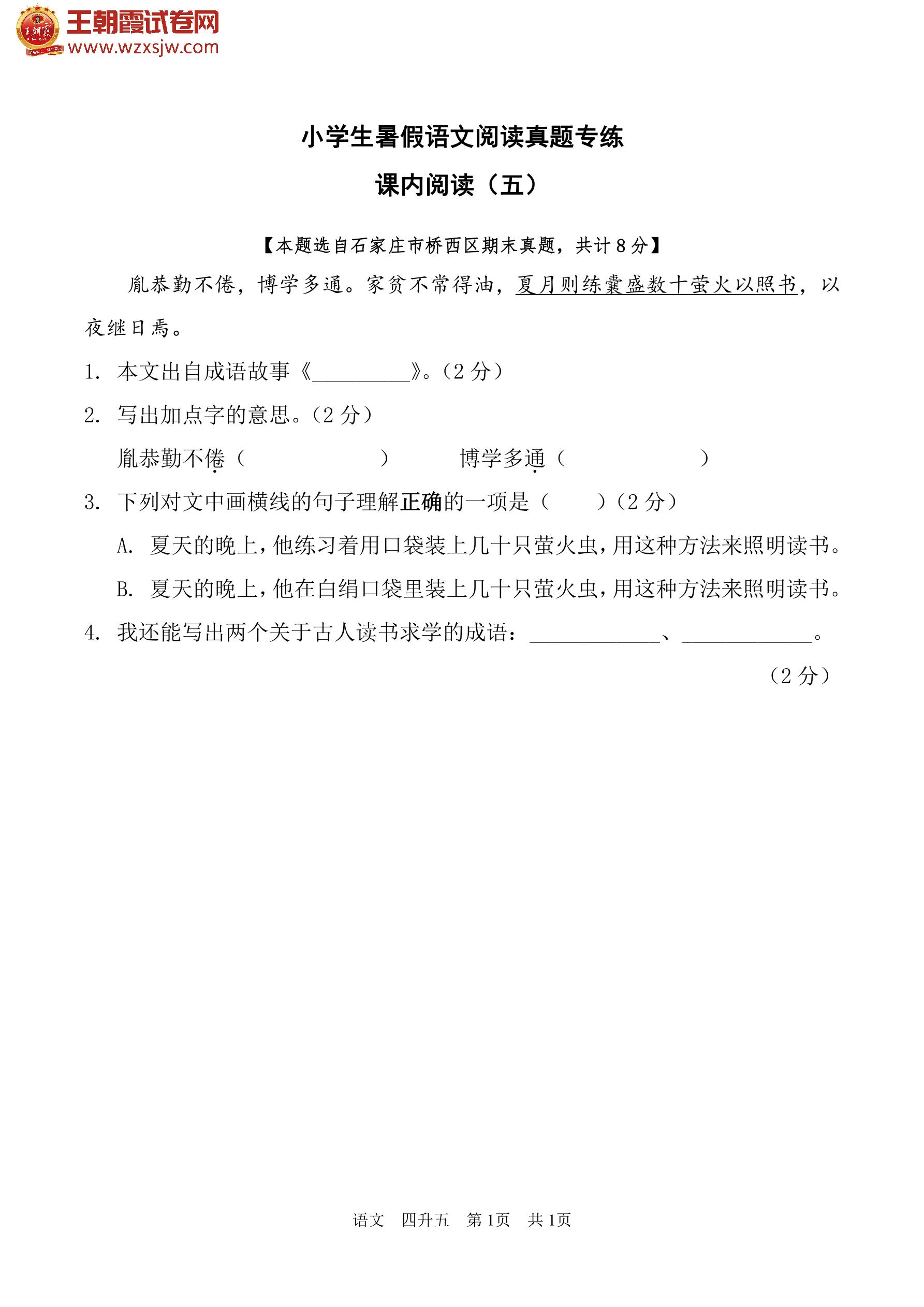 【四升五】小学生暑假语文阅读真题专练——课内阅读(五)