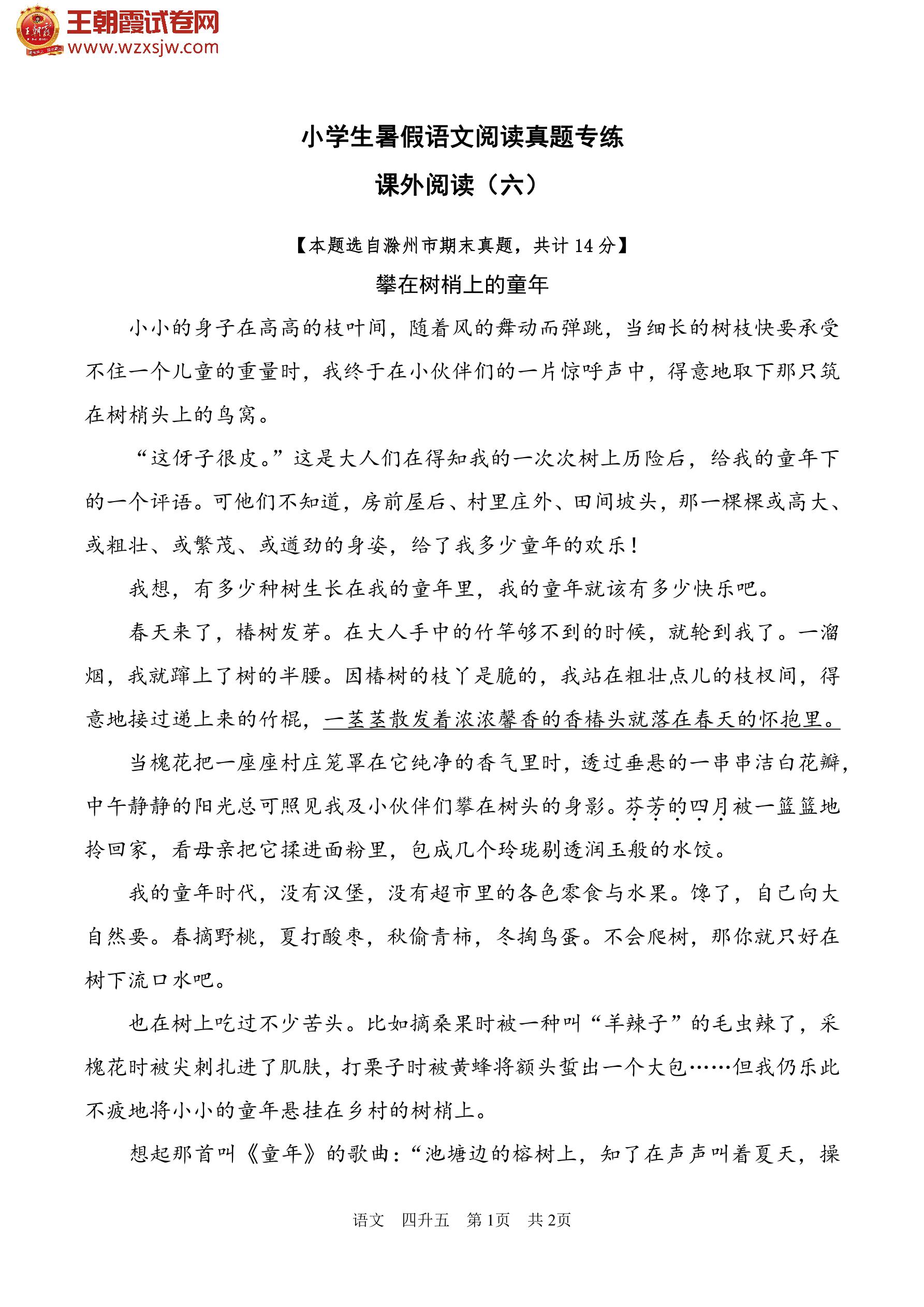 【四升五】小学生暑假语文阅读真题专练——课外阅读(六)