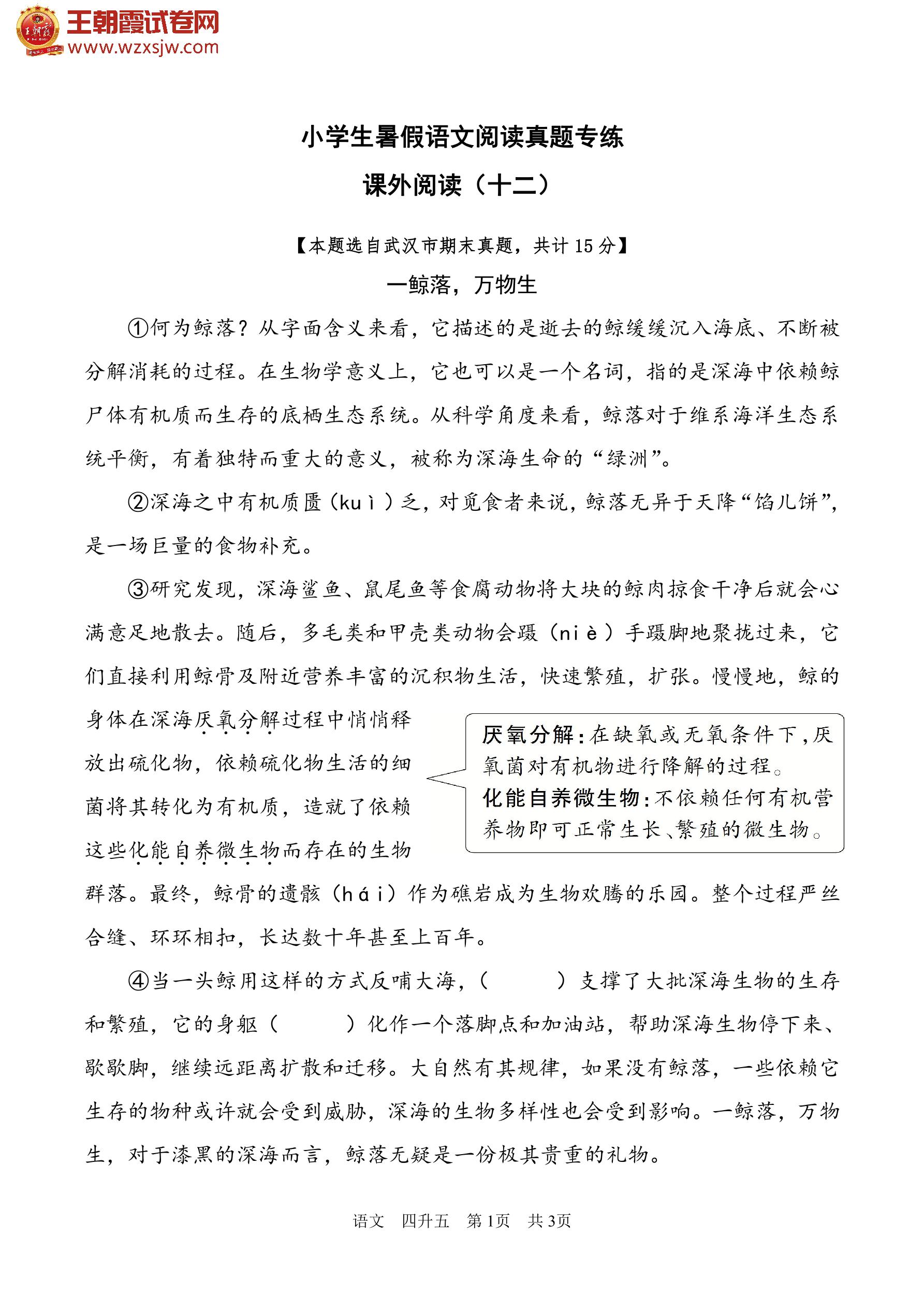 【四升五】小学生暑假语文阅读真题专练——课外阅读(十二)