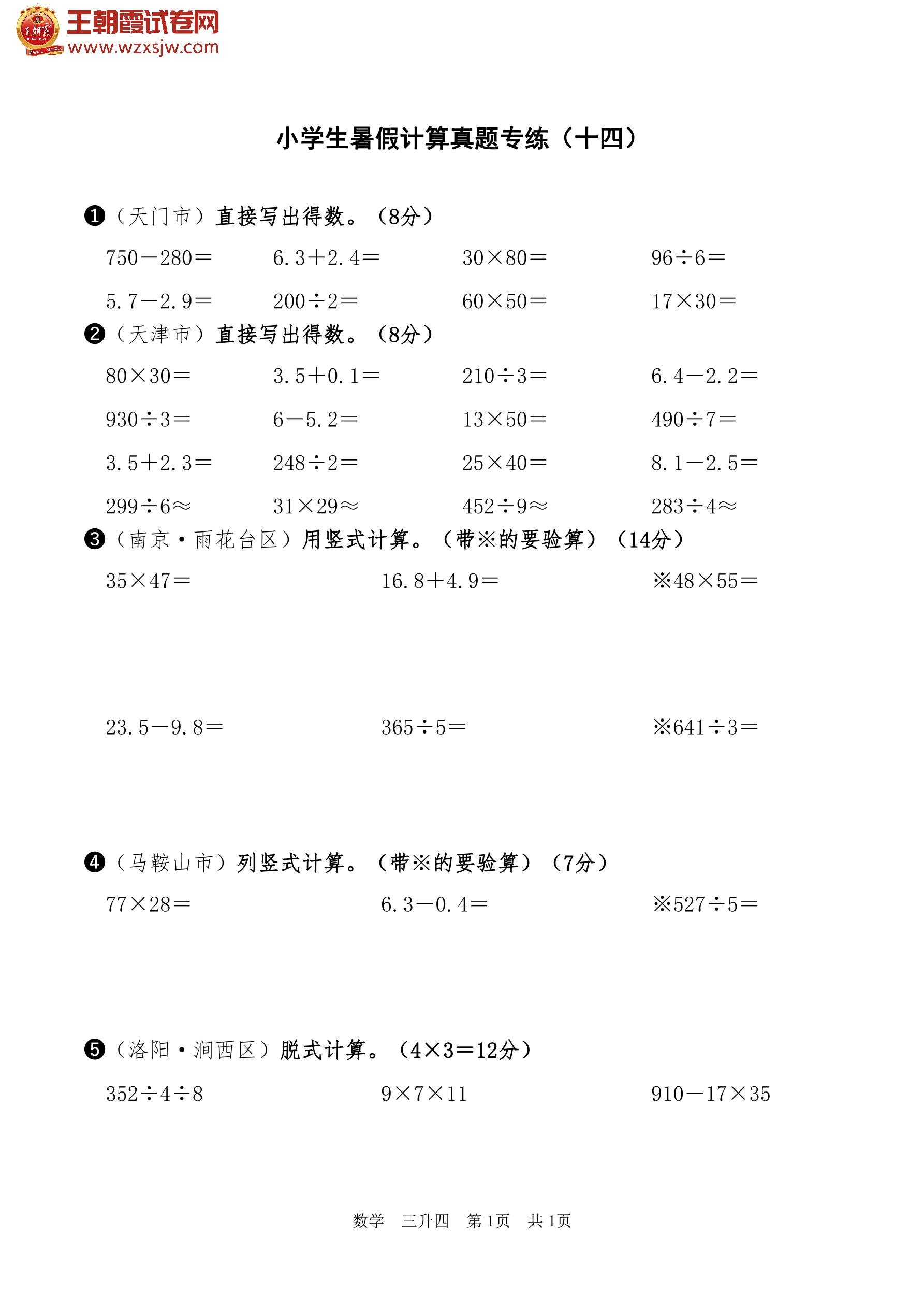 【三升四】小学生暑假计算真题专练(十四)