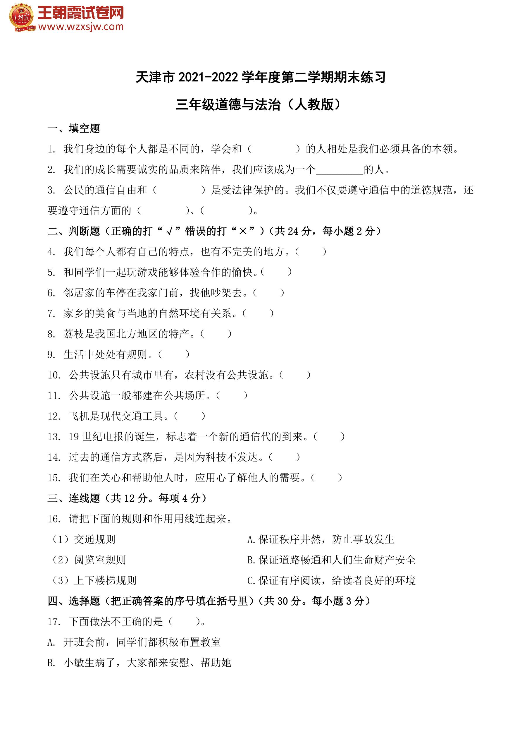 天津市2021-2022学年度第二学期期末练习三年级道德与法治(人教版)