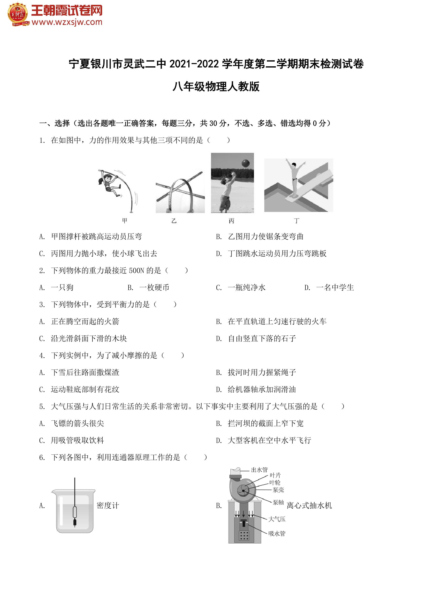 宁夏银川市灵武二中2021-2022学年度第二学期期末检测试卷八年级物理(人教版)