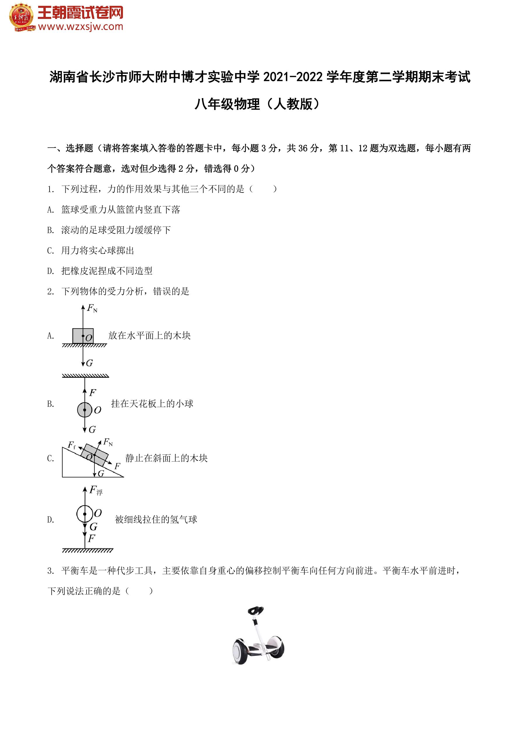 湖南省长沙市湖南师大附中博才实验中学2021-2022学年度第二学期期末考试八年级物理(人教版)