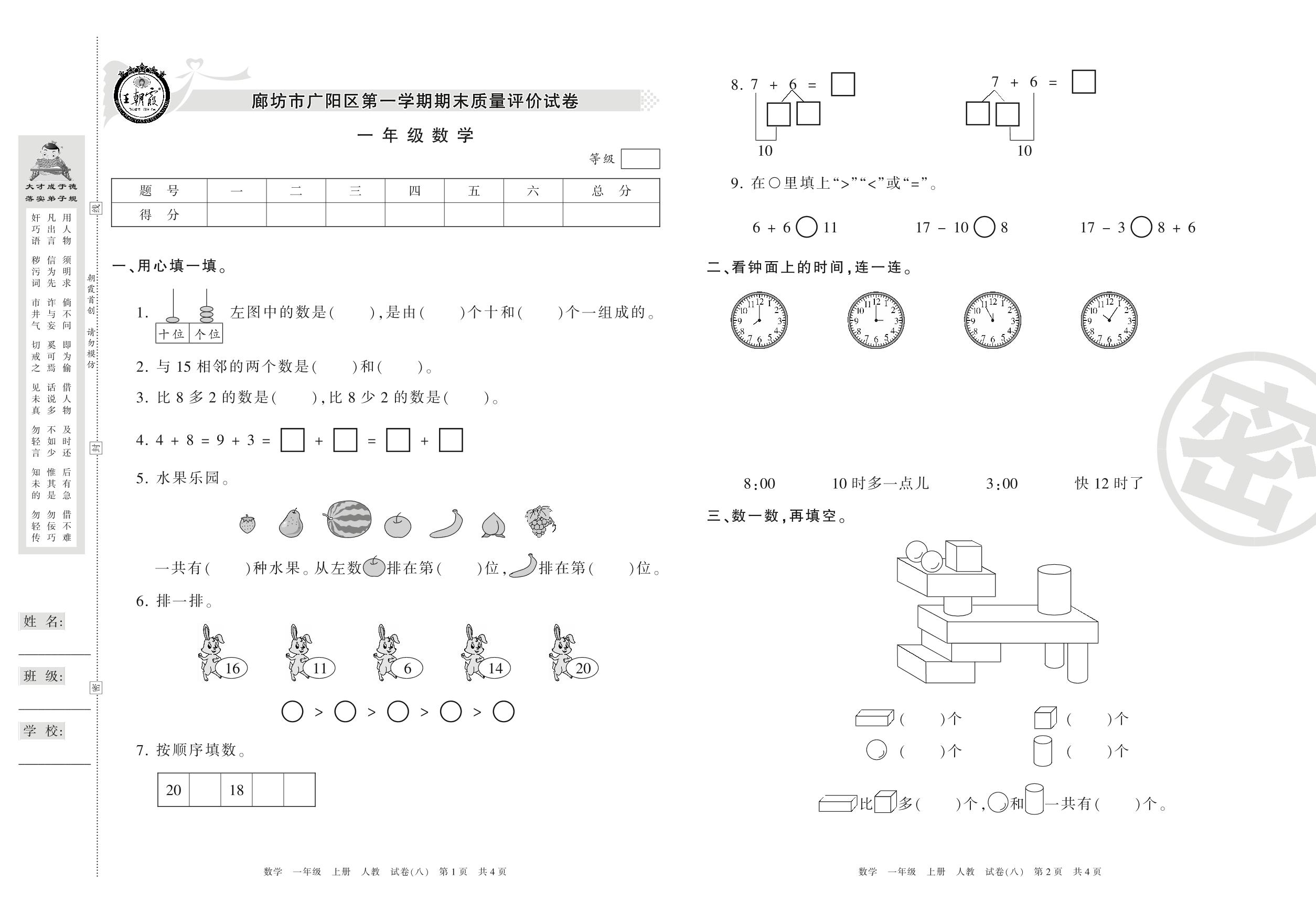 2016-2017学年第一学期廊坊市广阳区一年级数学试卷(人教版)【8】