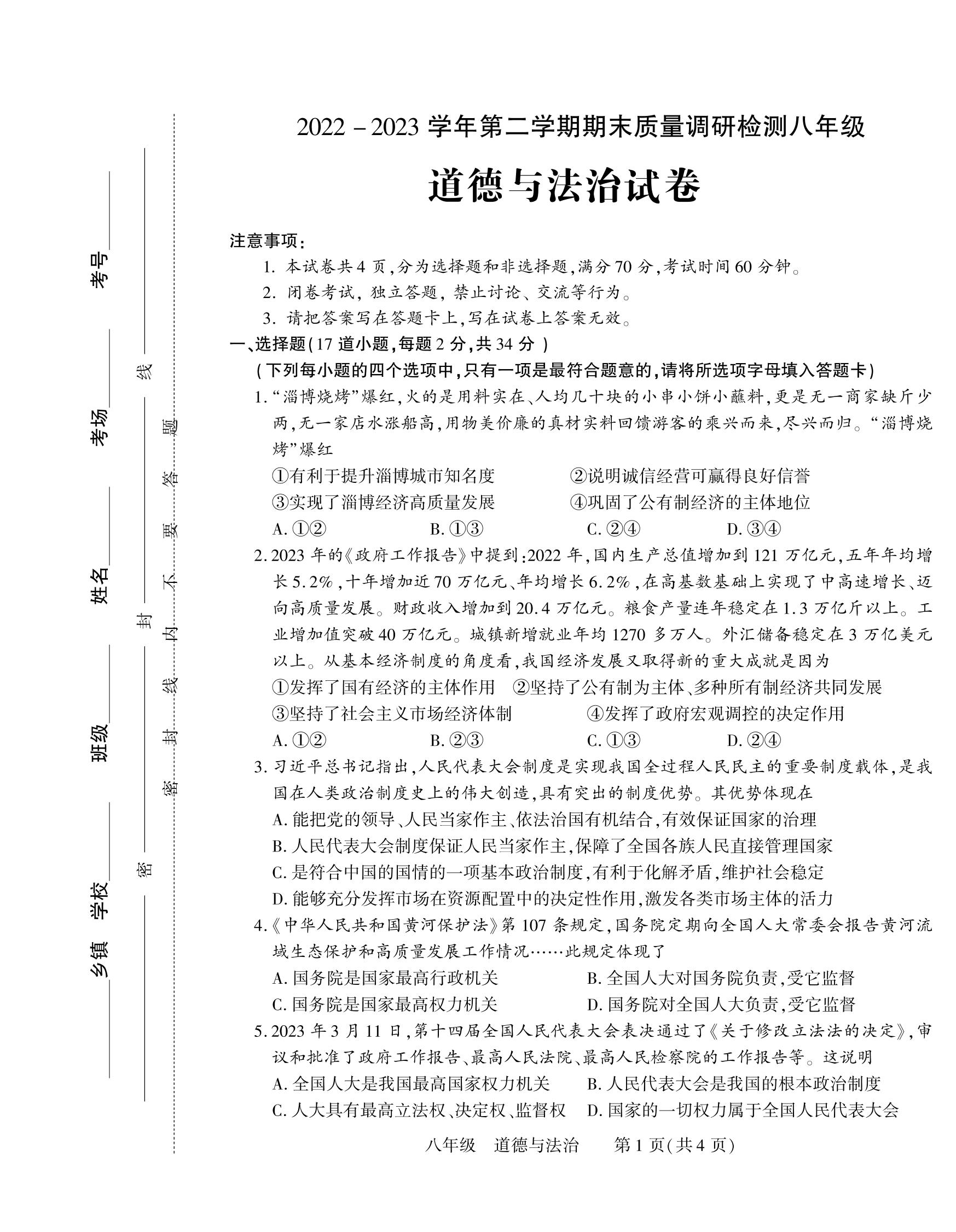 八年级道德与法治人教版下册期末卷