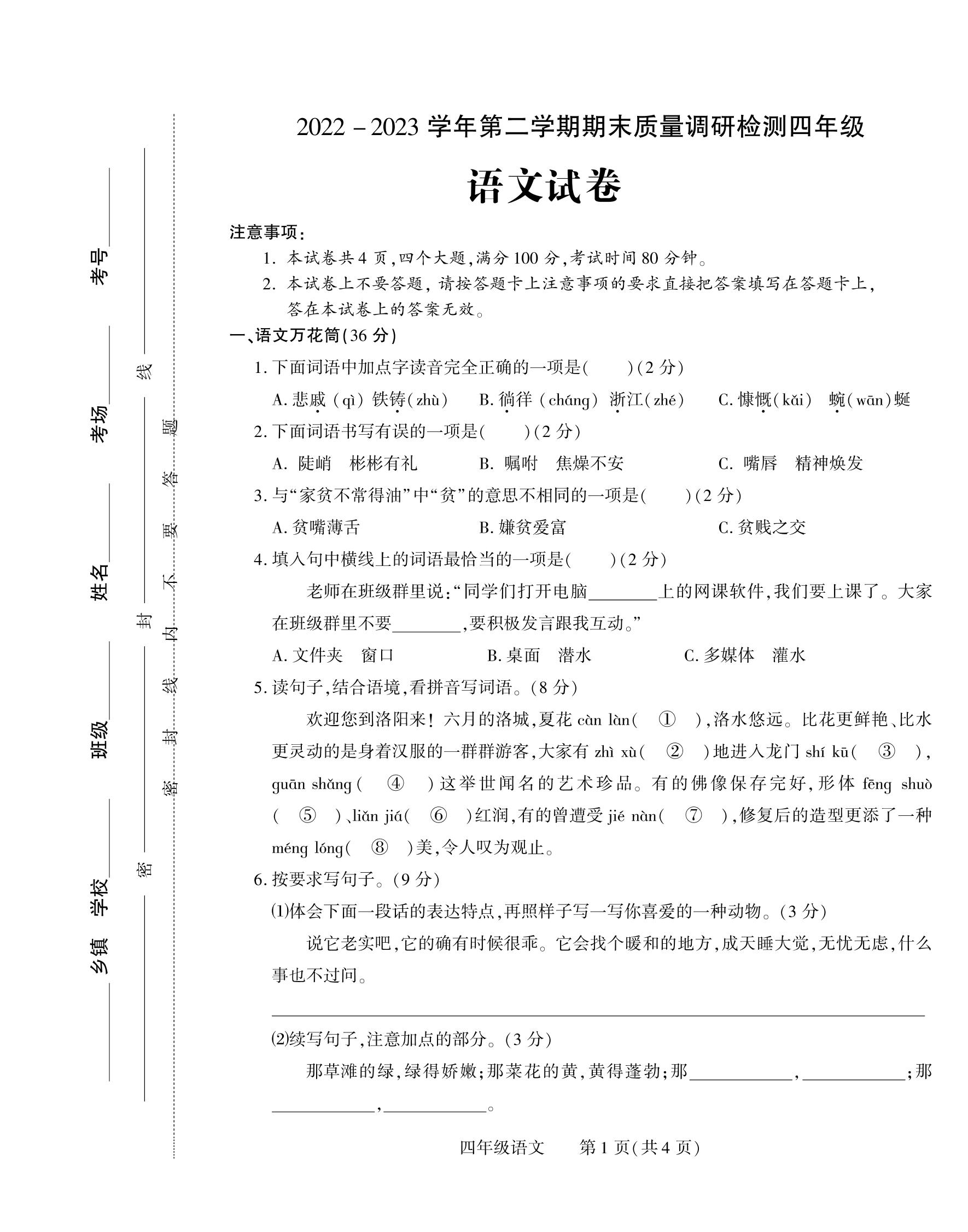 河南省洛阳市伊川县2022-2023学年第二学期期末质量调研检测四年级语文(人教版)