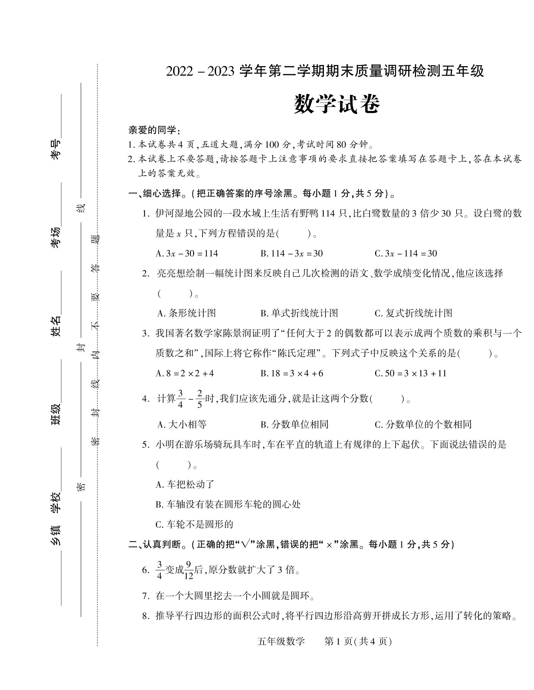河南省洛阳市伊川县2022-2023学年第二学期期末质量调研检测五年级数学(苏教版)