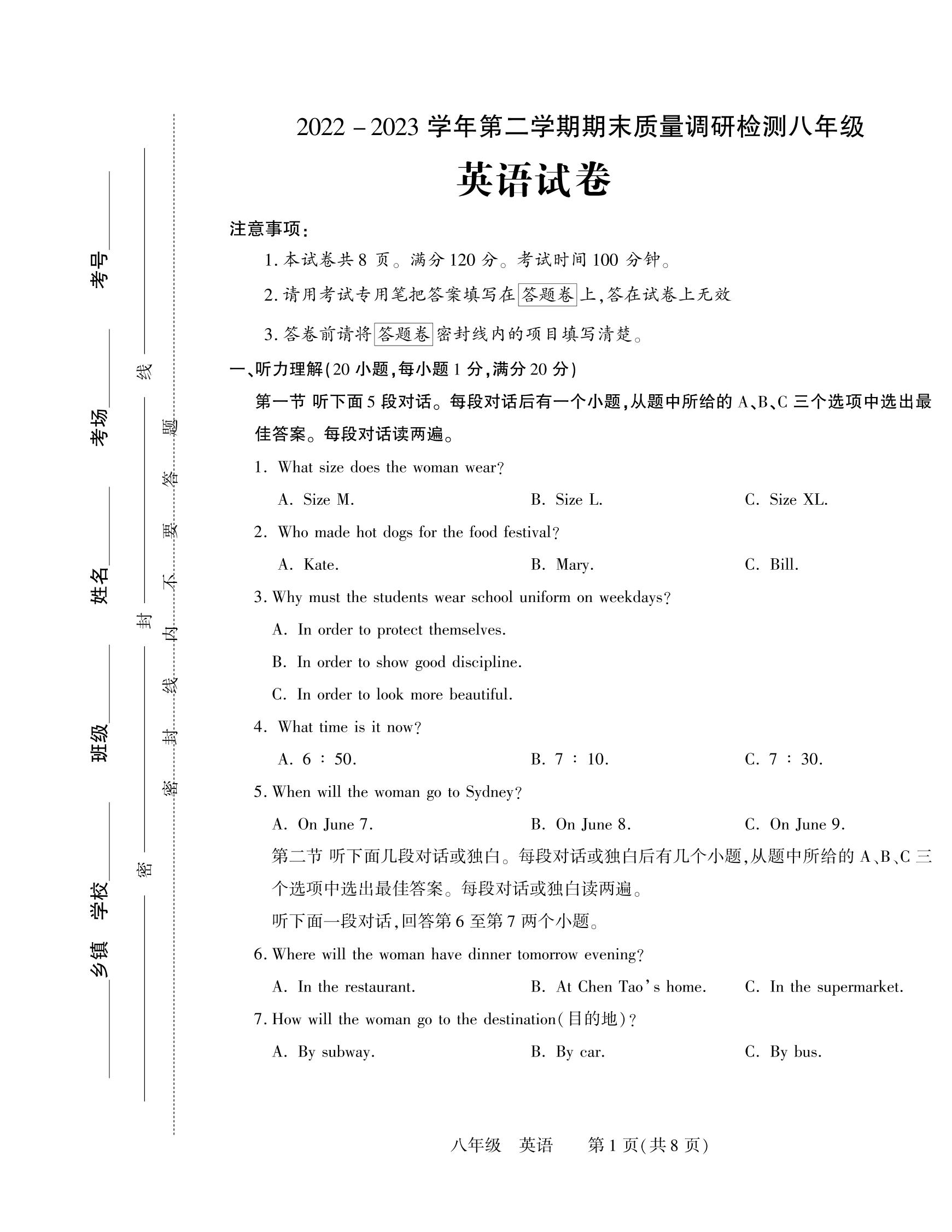 河南省洛阳市伊川县2022-2023学年第二学期期末质量调研检测八年级英语(人教版)【无听力音频】