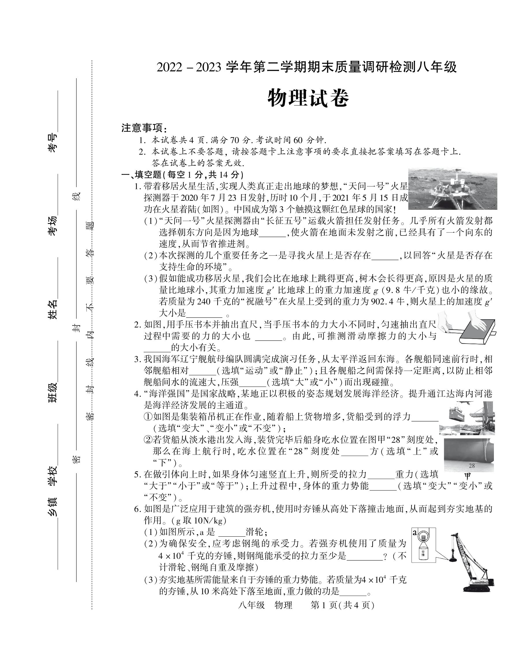 河南省洛阳市伊川县2022-2023学年第二学期期末质量调研检测八年级物理(人教版)