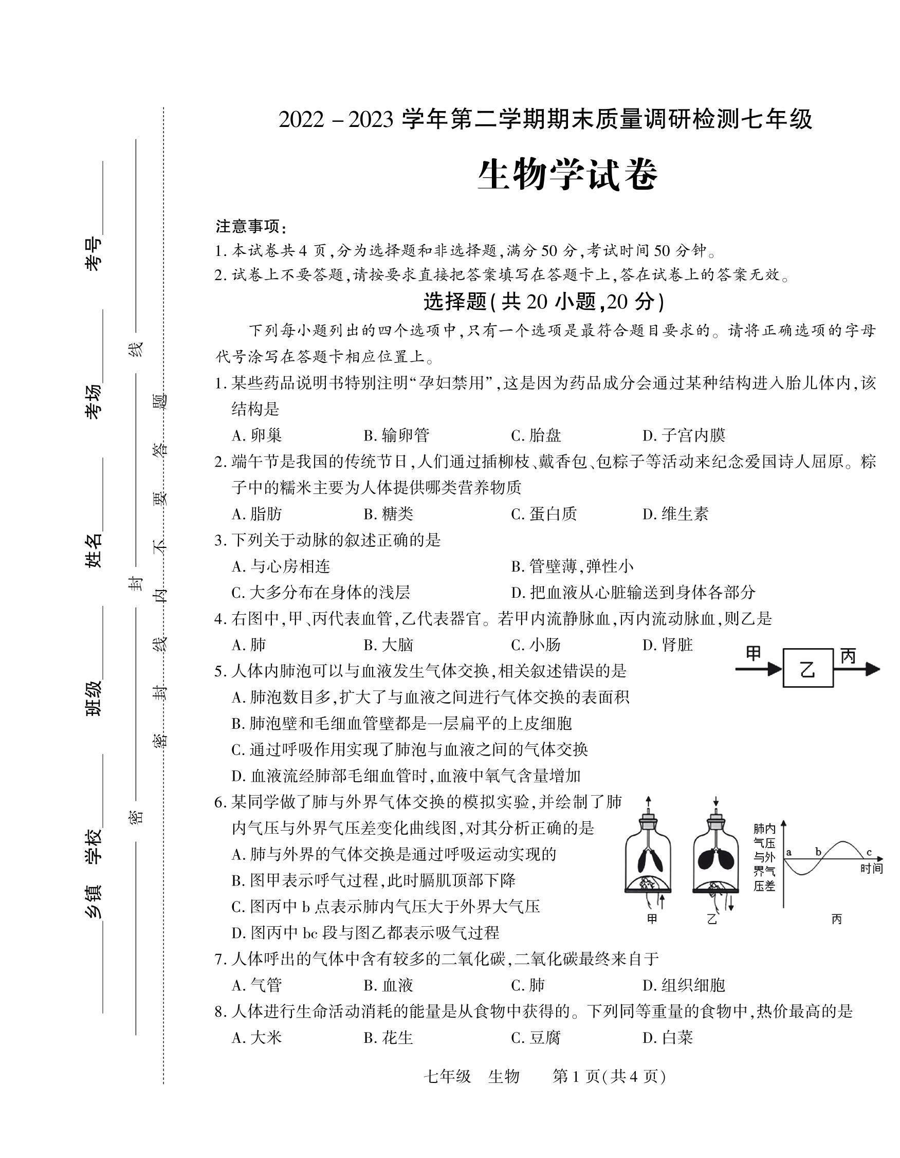 河南省洛阳市伊川县2022-2023学年第二学期期末质量调研检测七年级生物(人教版)