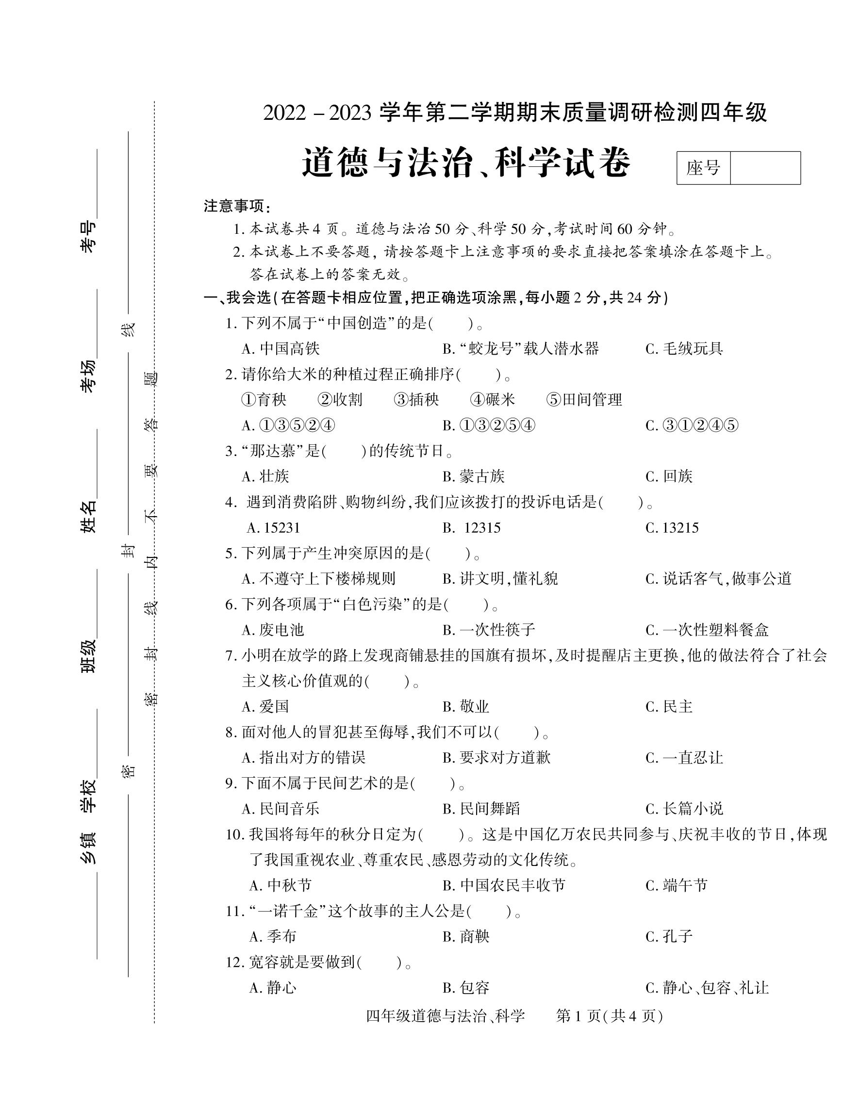 河南省洛阳市伊川县2022-2023学年第二学期期末质量调研检测试卷四年级道德与法治、科学