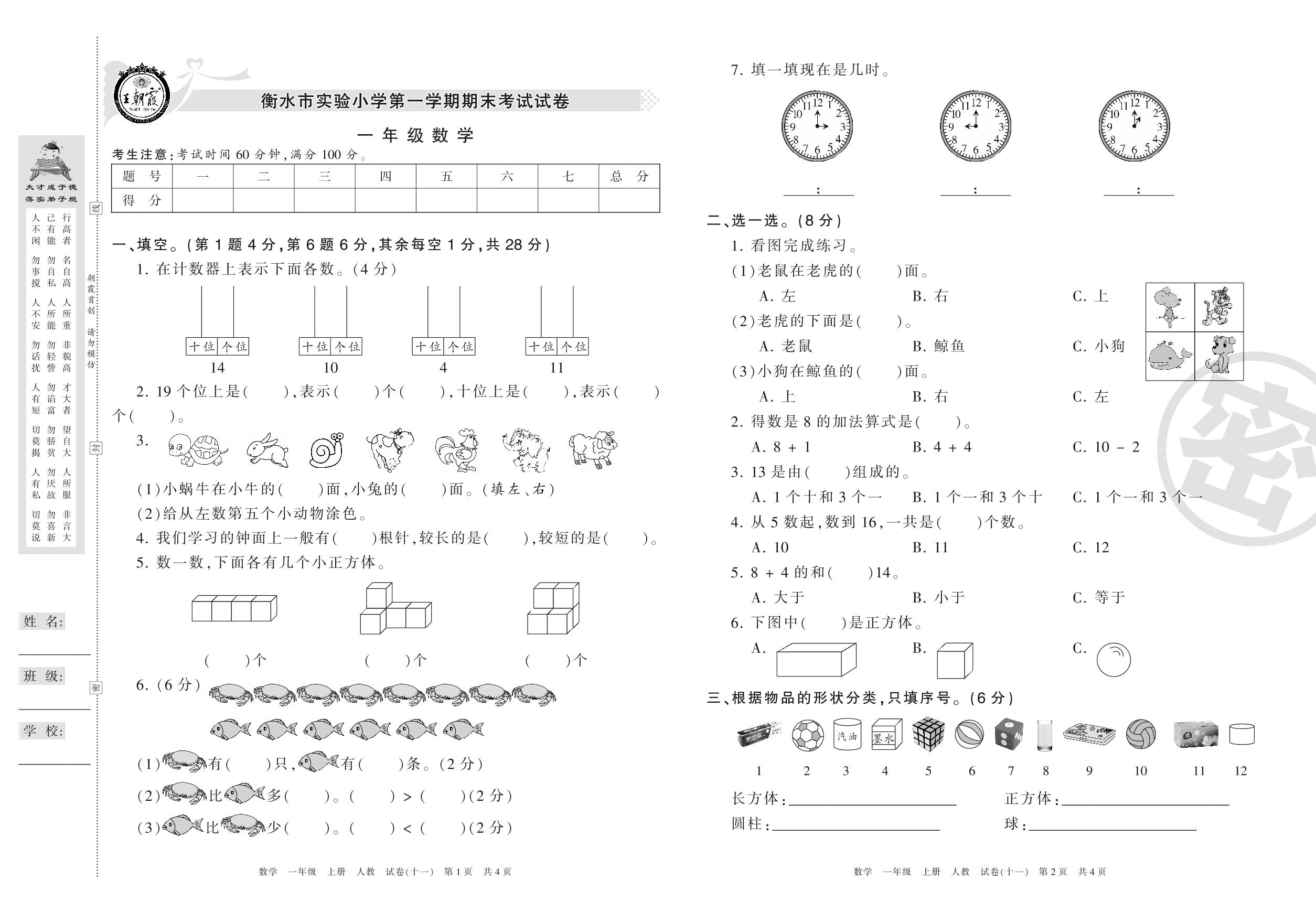 2016-2017学年第一学期衡水市实验小学一年级数学试卷(人教版)【11】
