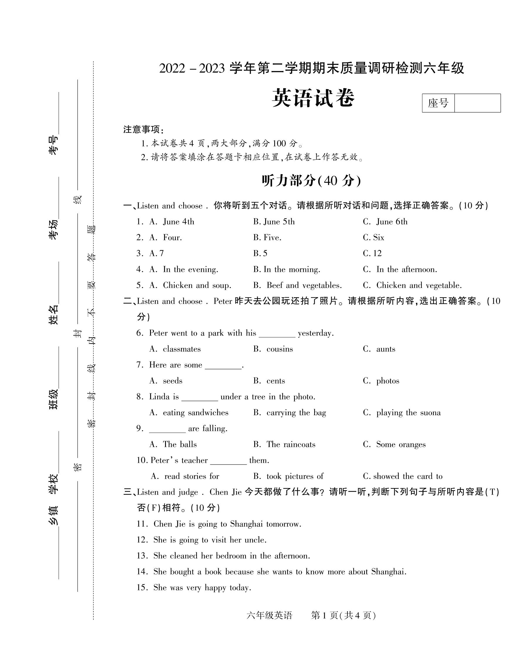 河南省洛阳市伊川县2022-2023学年第二学期期末质量调研检测试卷六年级英语(外研版)【无听力音频】