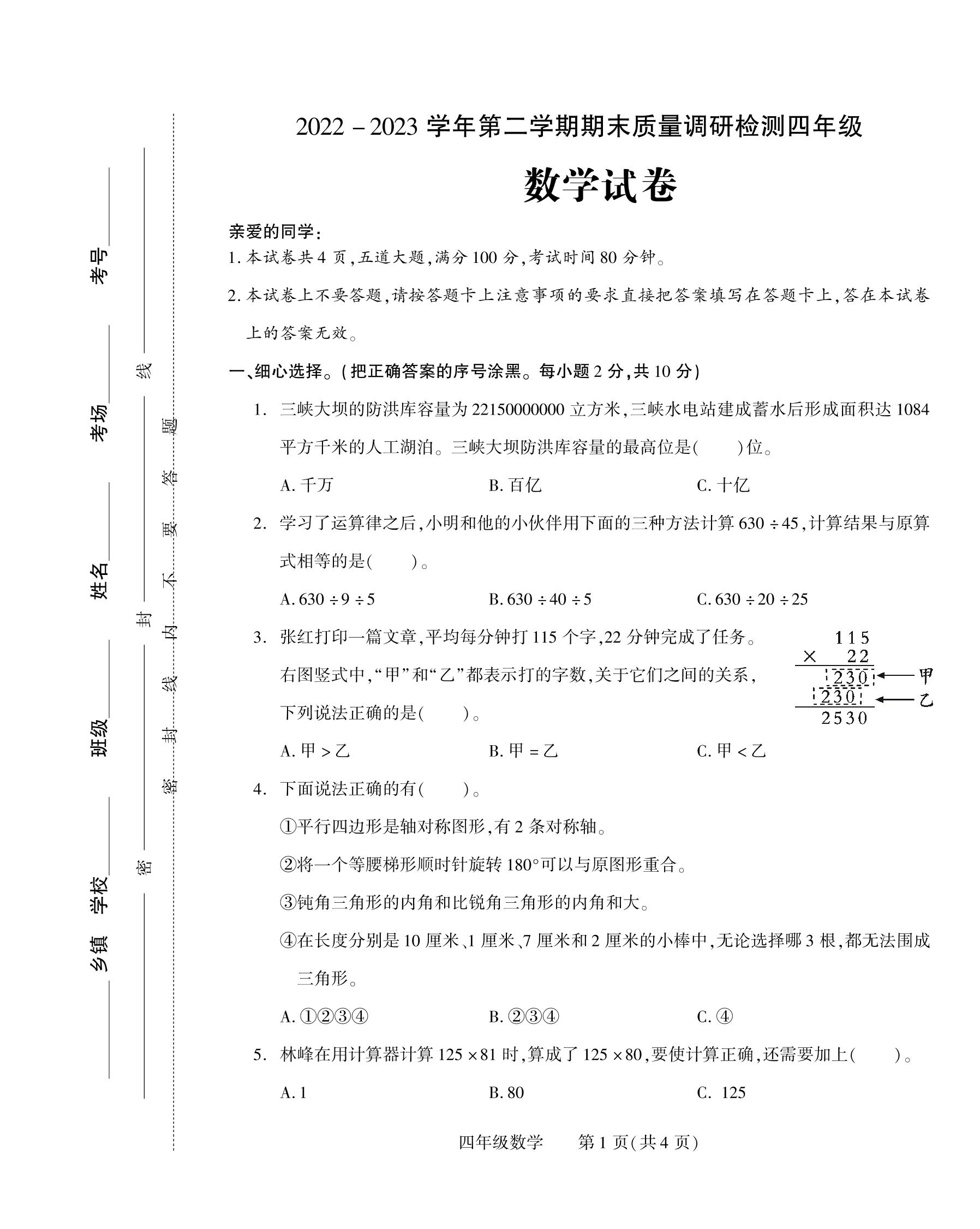 河南省洛阳市伊川县2022-2023学年第二学期期末质量调研检测试卷四年级数学(苏教版)