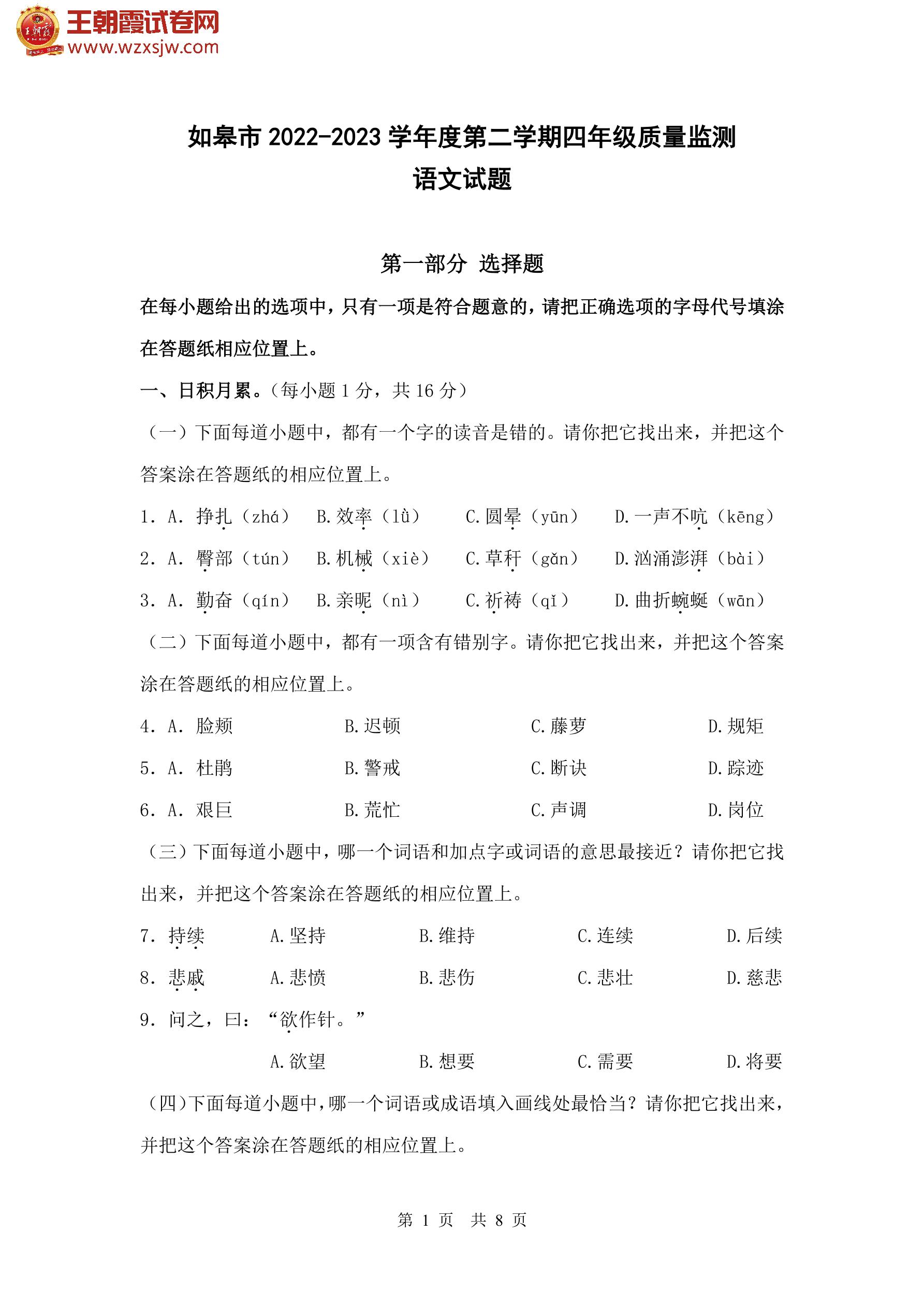 江苏省南通市如皋市2022-2023学年度第二学期质量监测四年级语文(人教版)