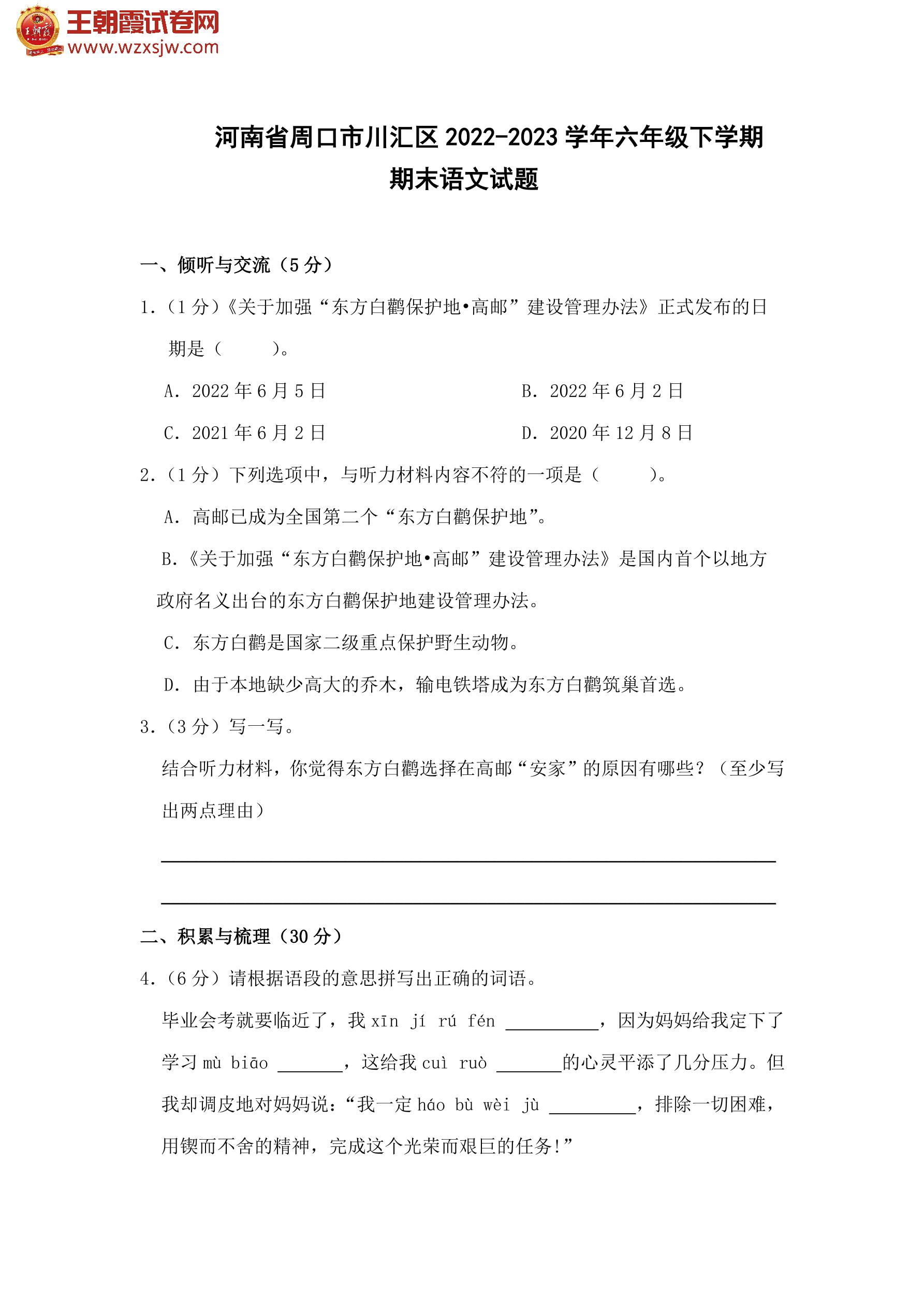 河南省周口市川汇区2022-2023学年六年级下学期期末语文试题(人教版)