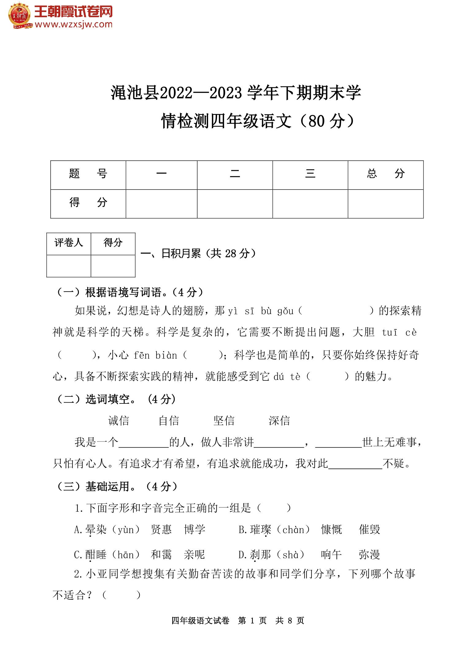 河南省三门峡市渑池县2022-2023学年四年级下学期期末学情检测语文试题(人教版)