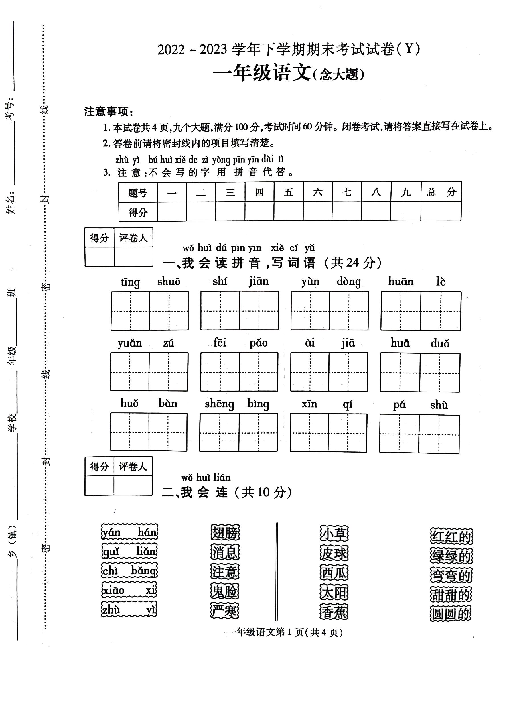 河南省漯河市舞阳县2022-2023学年一年级下学期期末考试语文试题