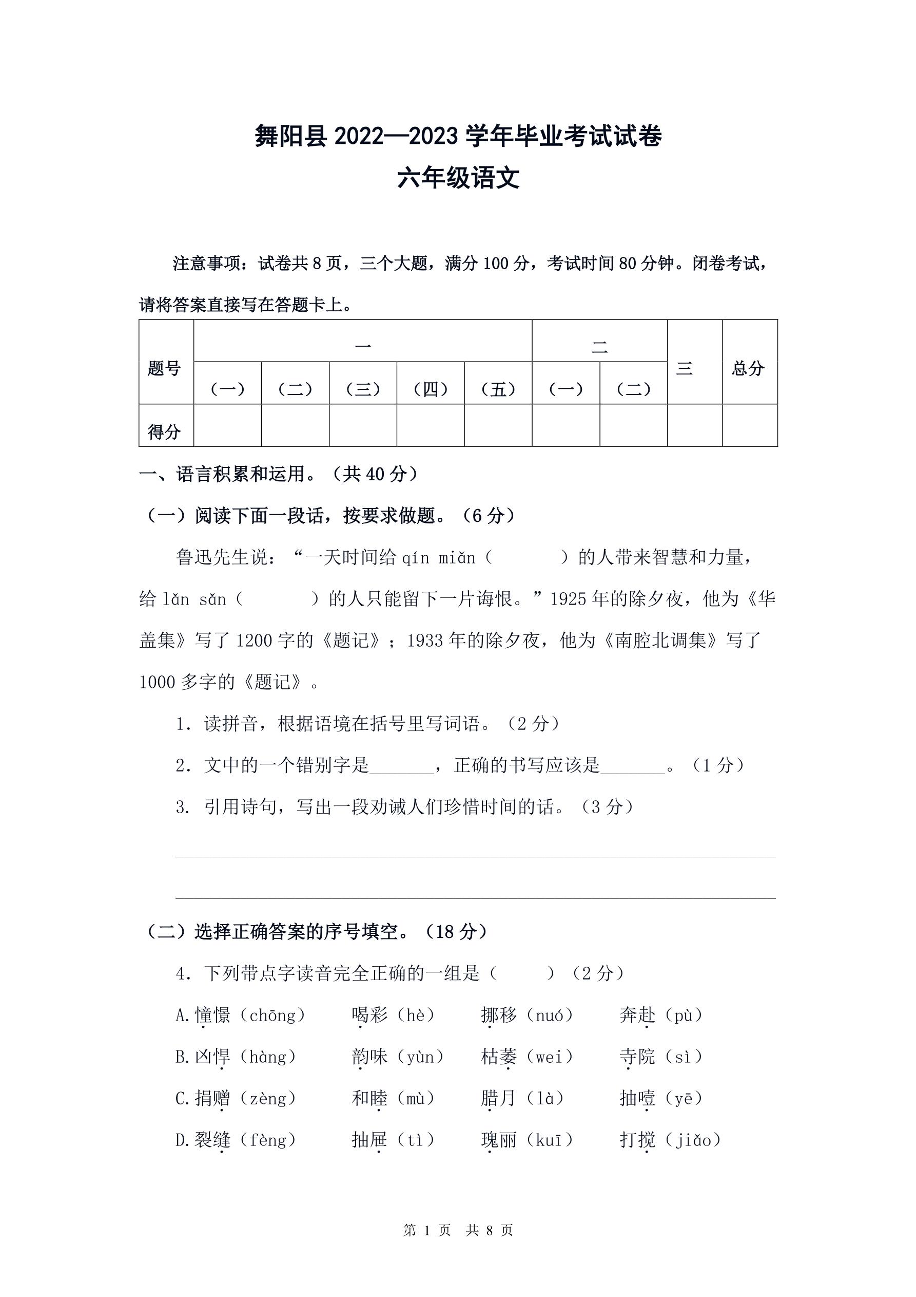 河南省漯河市舞阳县2022—2023学年毕业考试试卷 六年级语文