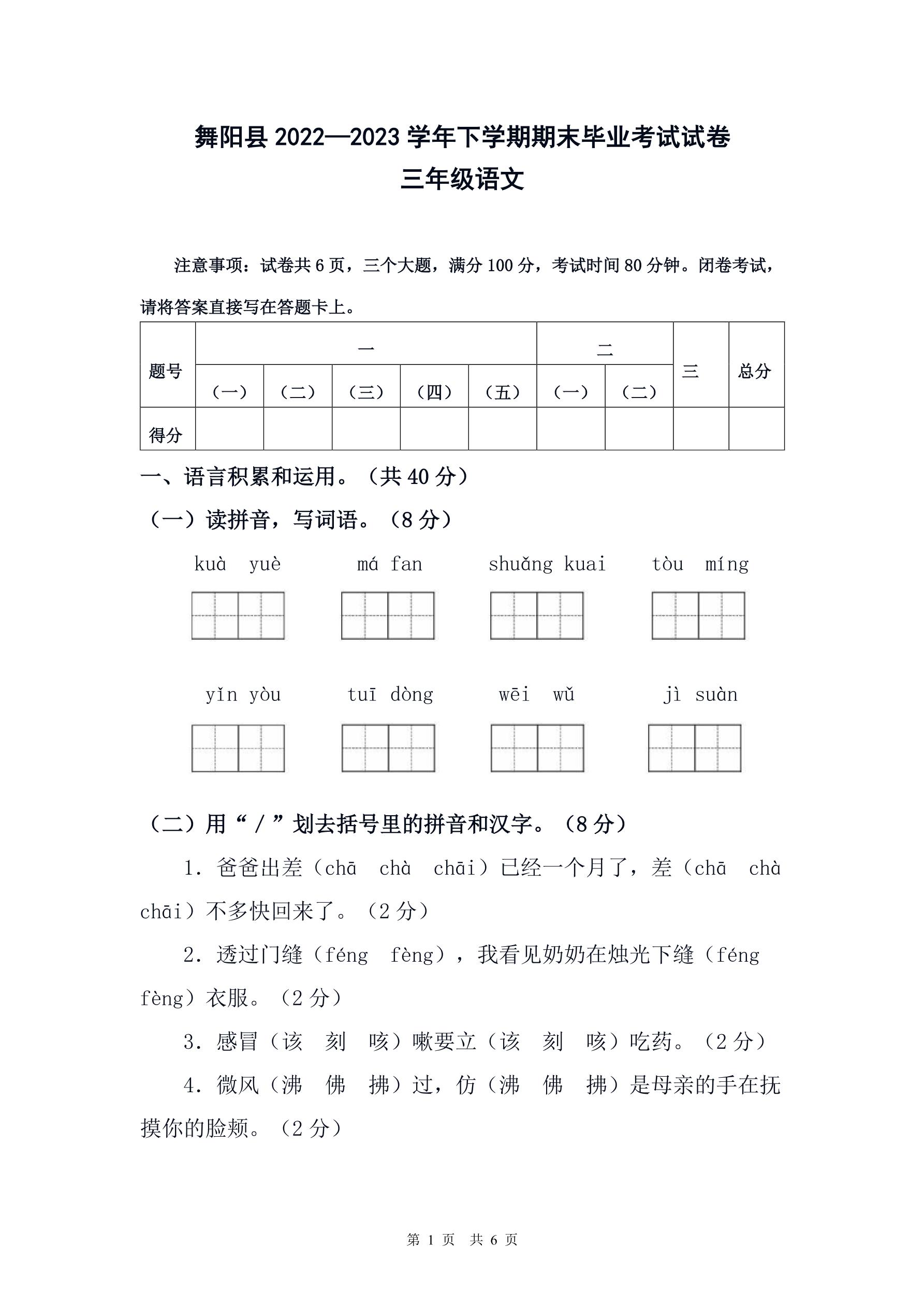 河南省漯河市舞阳县2022—2023学年下学期期末考试试卷三年级语文